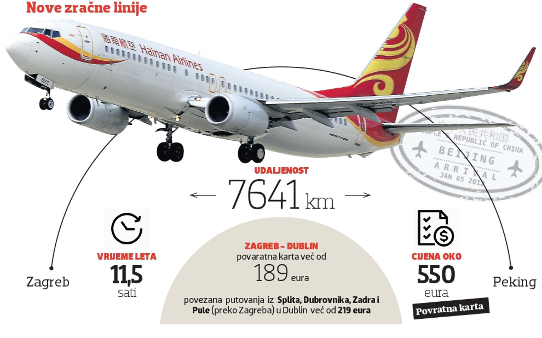 Pregovori o uvođenju novih ruta, kažu, podrazumijevaju povjerljivost pa ne mogu dati više informacija. Hainan Airlines je od lani uveo izravne letove Peking - Beograd s tehničkim slijetanjem u Pragu. Povratna karta na toj liniji može se kupiti već za 550 eura. Uvođenjem letova za Peking, Zagreb bi dobio četvrtu interkontinentalnu izravnu liniju, uz one u Dubai, Dohu i Toronto (sezonska linija). Pri tome bi Peking bio najudaljenije odredište a let na toj liniji najdulji iz ZL “Franjo Tuđman”. A sa tog aerodroma u ljetnom redu letenja ove godine Croatia Airlines će prvi put u povijesti uvesti redovite letove Zagreb - Dublin, i to od 3. svibnja do 28. listopada dvaput tjedno, četvrtkom i nedjeljom.
