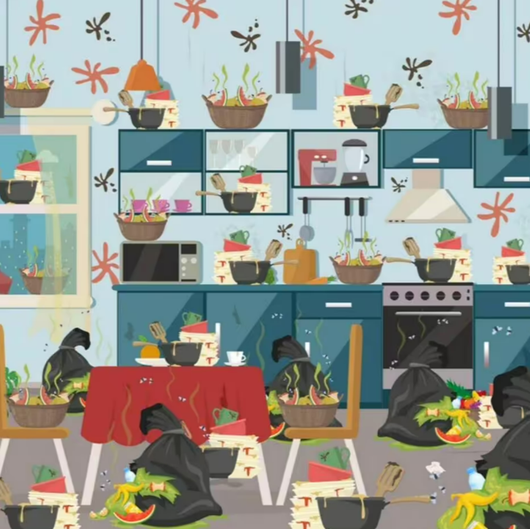 Slika prikazuje prilično sumornu studentsku kuhinju, punu raspadajuće hrane, prljavih lonaca i tava te smrdljivih vreća za smeće ostavljenih da trunu, prenosi Daily Express. No, među neurednim kaosom nalazi se košara svježeg voća. Pitanje je: možete li je pronaći? Možete zumirati sliku ako vam to pomaže u uočavanju detalja.