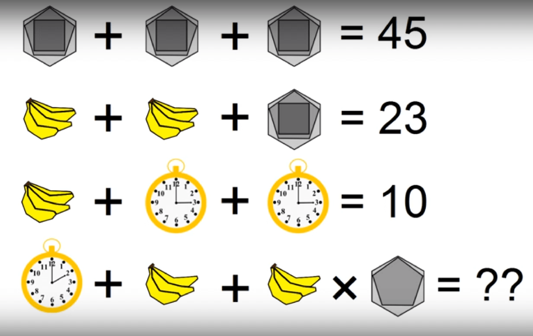 Pažljivo pogledajte ilustraciju. Primijeti ćete da vrijeme na satu nije jednako u svim redovima, kao što nije jednak ni broj banana. To vam može pomoći kako biste riješili ovu zagonetku.
