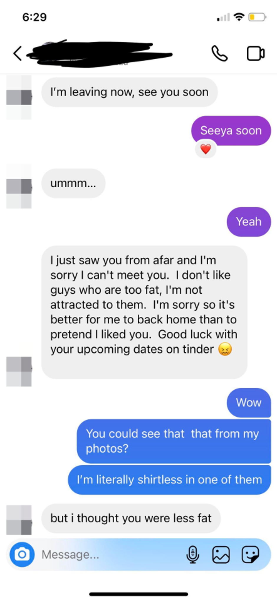 Podijelio je i snimke zaslona njihovih poruka, pa se tako vidi ženina poruka u kojoj mu je prvo napisala da uskoro stiže, a zatim je uslijedila druga poruka koja je glasila: "Upravo sam te vidjela izdaleka i žao mi je, ali ne mogu te upoznati. Ne volim dečke koji su predebeli jer me ne privlače. Bolje je da odem kući nego da se pretvaram da mi se sviđaš."