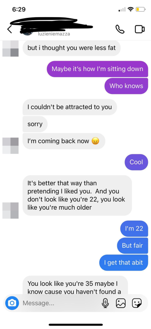 Muškarac je zgrožen ženinim porukama odgovorio da je to mogla vidjeti i na njegovim fotografijama, te da je na jednoj doslovno bez majice, na što mu je ona ponovno oštro odgovorila: "Mislila sam da si manje debeo, nisi me jednostavno mogao privući. Izgledaš kao da imaš 35 godina, trebao bi malo više paziti na sebe i ići u teretanu."