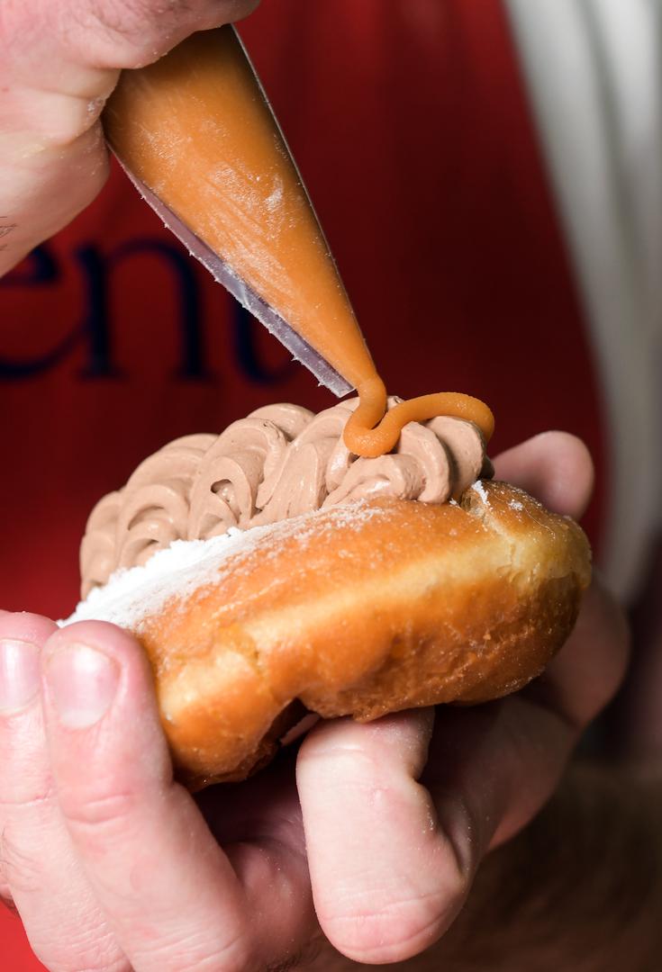– Temperatura ulja trebala bi biti maksimalno 165 stupnjeva, morate ih poklapati kad ih pečete i paziti da ne počnu gorjeti. Krafne se samo jednom okreću. Ako ih više puta okrenete, one počnu upijati ulje. Ovome možete doskočiti s malo alkohola, mi koristimo rum u tu svrhu, ali i zbog fine arome – savjetuje Luka. Aroma nam odgovara, ali ne možemo se odlučiti za nadjev.