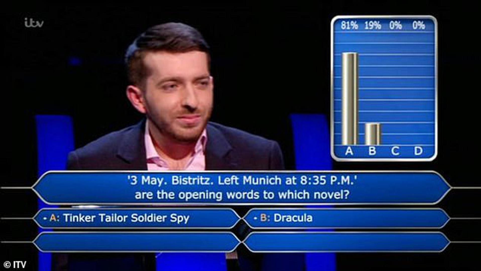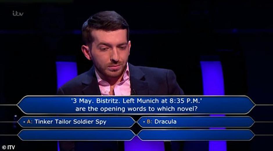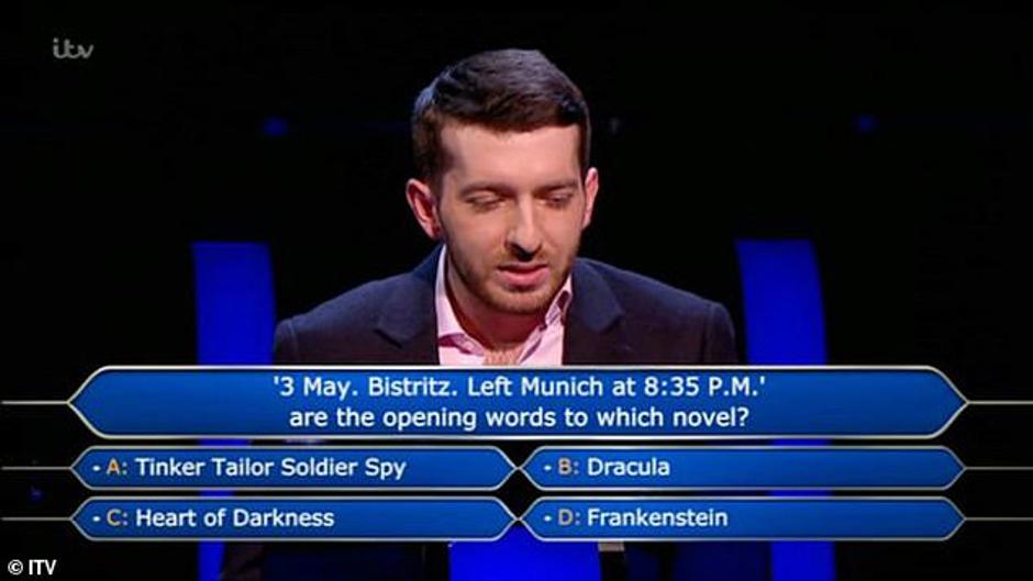 Ponuđena su mu bila četiri odgovora: "Dečko, dama, kralj, špijun", "Drakula", "Srce tame" i "Frankenstein". Natjecatelj je priznao da nije pročitao nijedan od četiri romana pa je zatražio voditelja Jeremyja Clarksona da iskoristi džoker "pola-pola" kako bi otklonio dva pogrešna odgovora. Otpali su romani Josepha Conrada i Mary Wollstonecraft Shelley, a među ponuđenim odgovorima ostali su "Dečko, dama, kralj, špijun" i "Drakula", prenosi Daily Mail.