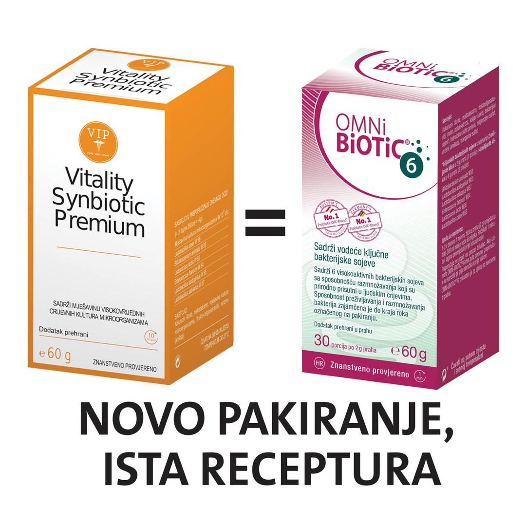 OMNi-BiOTiC® 6 dolazi u pakiranju od 28 vrećica, 60 g i 300 g praha. Zanimljivo je napomenuti i kako se ovim putem napravila svojevrsna nova inačica sinbiotika Vitality Synbiotic Premium, koji se svojom kvalitetom te identičnom OMNi-BiOTiC® 6 recepturom, odavno istaknuo na tržištu.