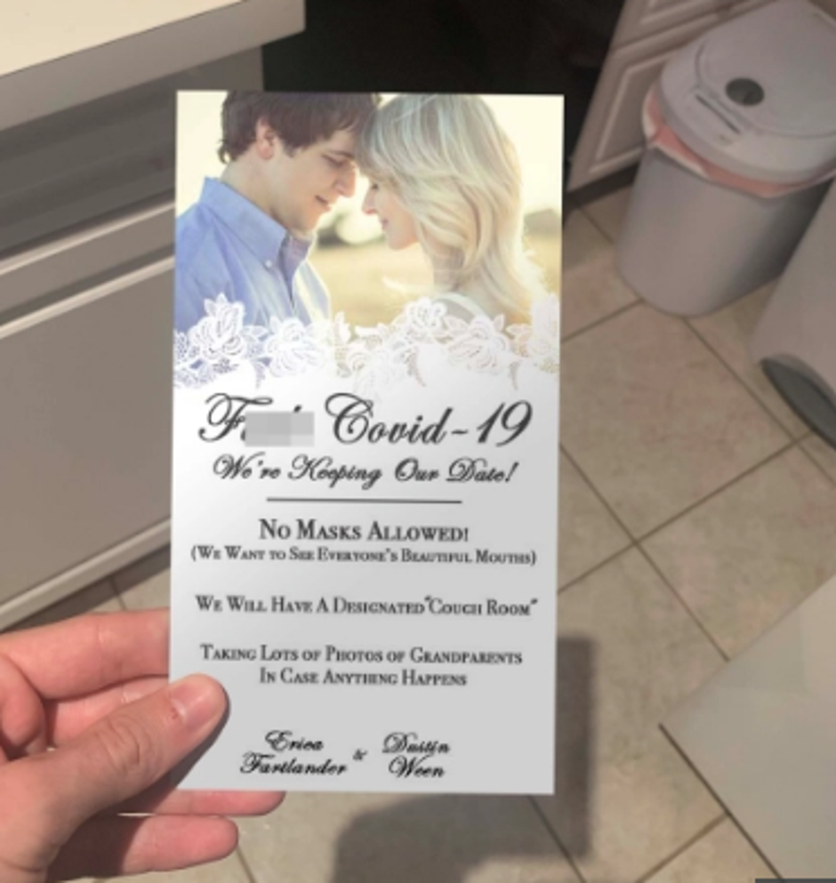 Korisnik Twittera Dan White podijelio je na svom profilu fotografiju pozivnice za vjenčanje u kojoj mladenci iznose neke neobične zahtjeve. Iako pandemija još uvijek traje, ovaj par odlučio je održati vjenčanje, ali po svojim pravilima. Naime, gostima su zabranili nošenje zaštitnih maski!