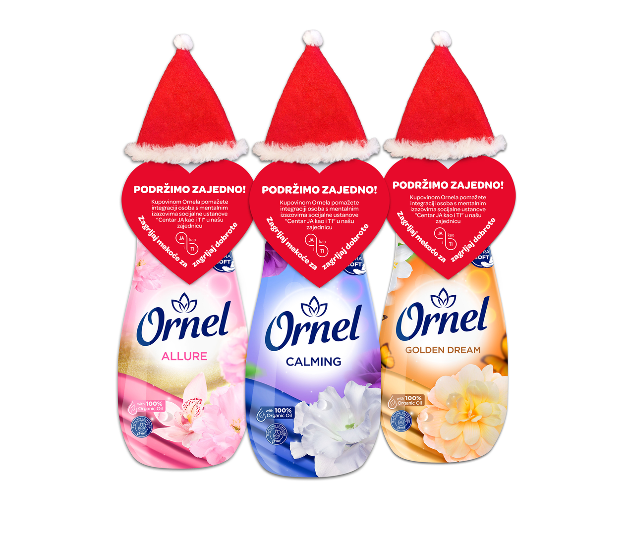 Treća godina projekta Podržimo zajedno koji Saponia provodi u suradnji s ustanovom socijalne skrbi, “Centrom JA kao i TI” ističe važnost podrške odraslim osobama s izazovima mentalnog zdravlja. Njihovi ručno rađeni ukrasi u obliku kapica Djeda Mraza na bocama Ornela postaju simbol uključenosti, dostojanstva i društvenog zajedništva.