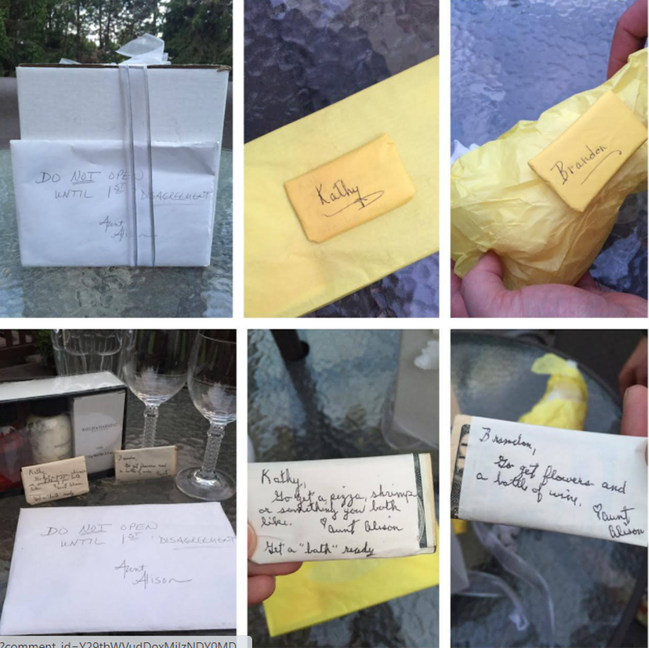 Kathy i Brandon Gunn iz Michigana vjenčali su se u rujnu 2007. godine, a taj su dan od njene tete na dar dobili kuvertu za koju im je teta rekla da je "čuva ključ za spas braka".