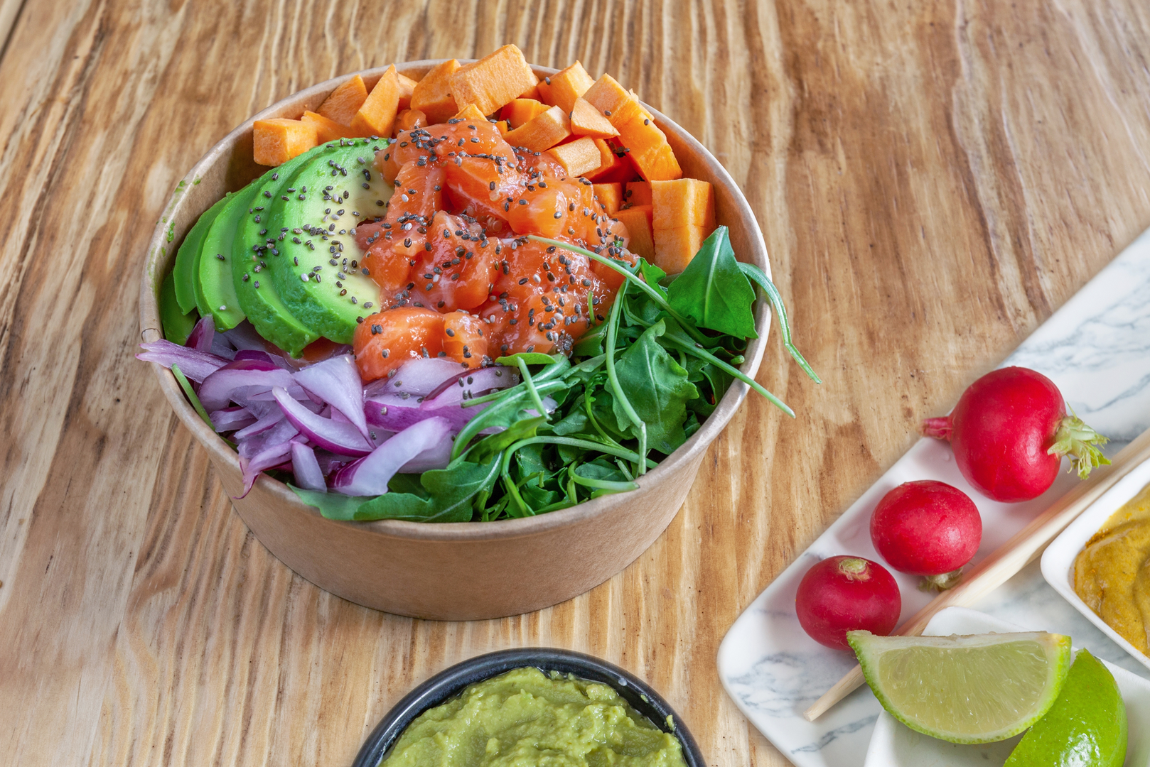 Mladi luk narežite na kolutiće. Krastavac i rotkvice narežite na kolutiće, a mrkvu na trakice. Povrće začinite solju, paprom i balzamičnim octom te ostavite da se kratko marinira. U duboki tanjur ili zdjelu složite povrće, dodajte pečenog lososa, prelijte umakom te na kraju dodajte sjeckani mladi luk i narezani avokado.