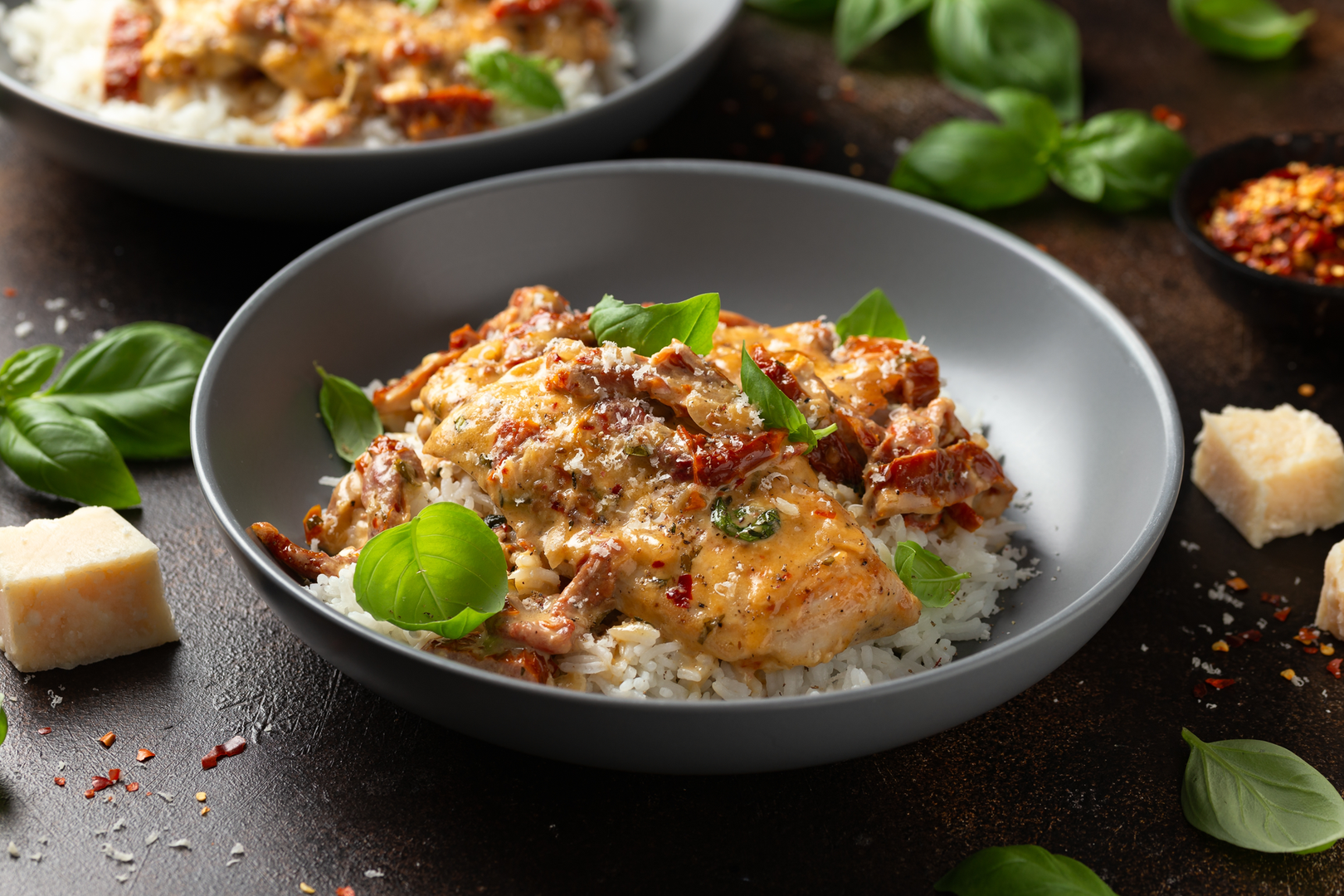 U tavi zagrijte maslinovo ulje. Pileća prsa obilno začinite solju i paprom te pecite oko 5 minuta sa svake strane, pa ih prebacite na tanjur. U istu tavu dodajte još malo maslinovog ulja, češnjak i ostale začine. Potom dodajte sušene rajčice, temeljac i vrhnje, kratko prokuhajte pa umiješajte parmezan. Pustite da kratko prokuha, zatim vratite meso u umak. Tavu prebacite u zagrijanu pećnicu i pecite još 15 minuta. Za kraj dodajte svježi bosiljak i poslužite uz prilog i salatu po želji.