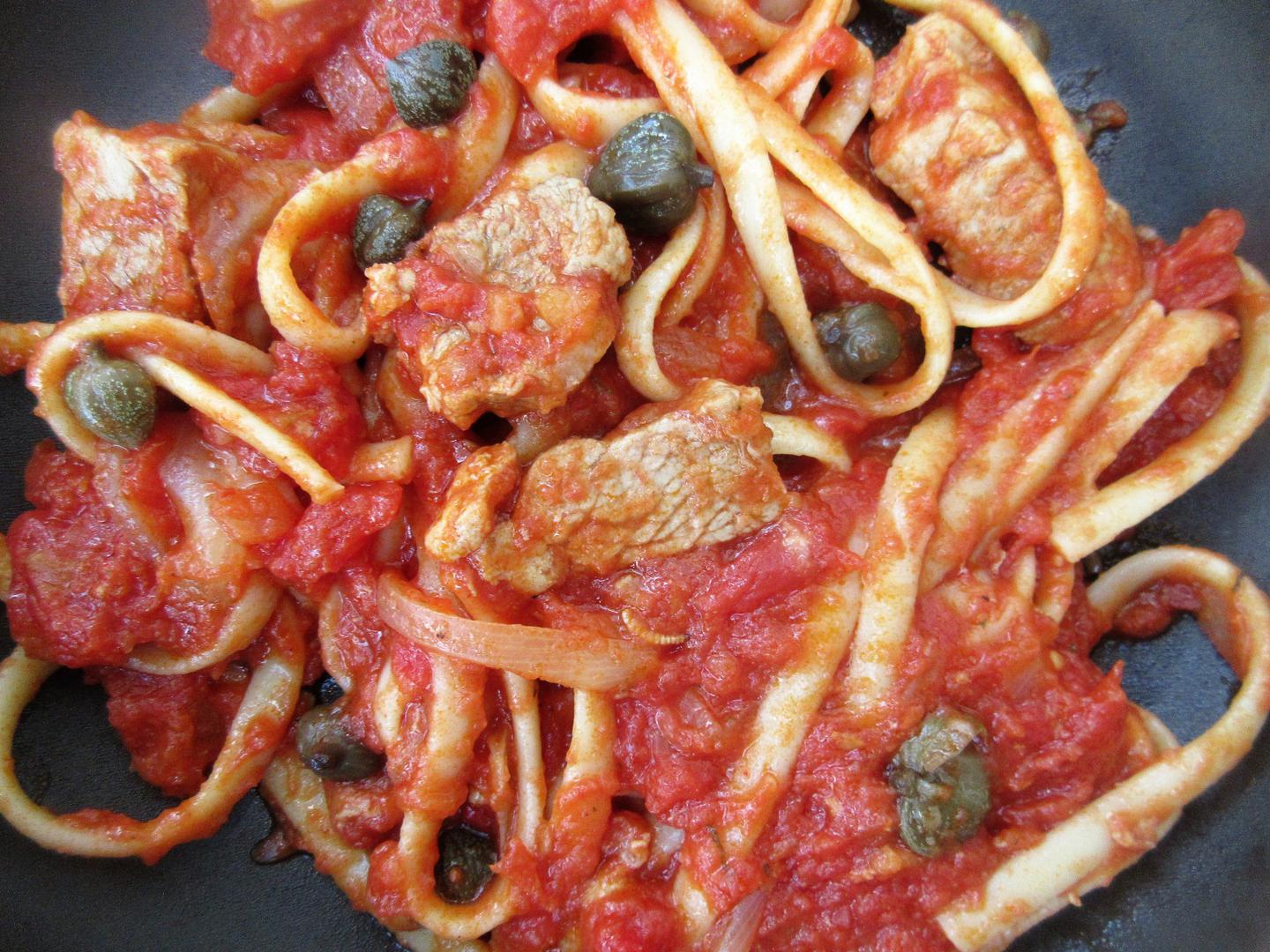 Oko 1½ kg pomidora ili rajčica izrežite u komade i pirjajte na 1½ dl maslinova ulja, povremeno miješajući dok ne dobijete gustu šalšu. Posebno u drugoj tavi na 1 dl maslinova ulja propirjajte 40 dag teleće mekači u kockicama, pa kad zazlate sve pridodajte umaku od rajčica. Tada posolite i zaljutite s 1 sjeckanim malim poluljutim crvenim paverunom ili feferonom i zasladite s 1 žlicom šećera te dodajte nekoliko crnih pečenih maslina. Pustite da se još malo sve prožme na vatri, a onda napolitanski ragu prelijte na ½ kg skuhanih i procijeđenih špageta na gitaru, sve dobro promiješajte i služite jelo odmah, po volji posuto s malo ribanog tvrdog sira, najbolje parmezana.