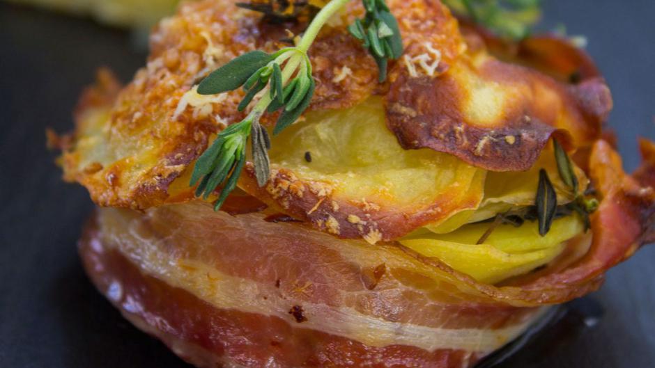 Krumpir ogulite i narežite na tanke kolutove ili naribajte na tanke kriške. Maslac rastopite i prelijte ga preko krumpira, dodajte parmezan, ružmarin, majčinu dušicu, mljevenu papriku, češnjak, sol i papar. Sve dobro promiješajte. Kalupe premažite maslacem pa njihovu unutrašnjost obložite listom slanine i punite ih pripremljenim krumpirom. Na kraju svaku ’’piticu’’ dodatno pospite parmezanom, mljevenom paprikom i majčinom dušicom. Pecite na 200 stupnjeva oko 60 minuta.