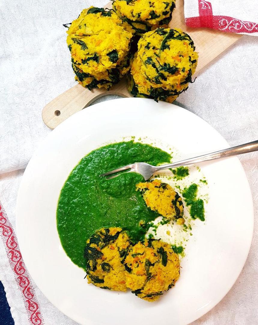 Proso operite pa ga stavite u lonac hladne vode u omjeru 1:4 neka se kuha na jakoj vatri dok ne zakipi, a onda posolite, poklopite, smanjite vatru na sasvim lagano i nastavite kuhati još 10-ak minuta. Ne smije se pretvoriti u kašu i raskuhati, zrna trebaju ostati cijela. Kada je proso kuhan, procijedite ga od viška vode i prebacite proso u zdjelu pa dodajte začine po želji i promiješajte. Špinat operite, mrkvu ogulite i naribajte, mladi luk nasjeckajte na kolutove. U tavi s malo maslinovog ulja stavite pirjati luk i mrkvu. Odmah posolite pa nastavite pirjati desetak minuta da povrće omekša. Dodajte špinat i češnjak i pirjajte dalje dok špinat ne pusti svu tekućinu. Dodajte povrće i jaje u zdjelu s prosom i sve dobro promiješajte. Kušajte pa dodajte još začina ako je potrebno. Rukama oblikujte polpete i stavljajte ih na lim za pečenje koji ste obložili masnim papirom. Svaku polpetu pokapajte maslinovim uljem.Stavite ih u prethodno zagrijanu pećnicu na 180º C, neka se peku dok ne poprime zlatnu boju i dok ne postanu kompaktni tako da ih bez problema možete izvaditi (oko 30-40 min). Servirajte uz salatu ili kremu od špinata.