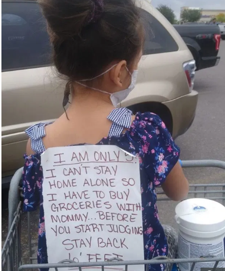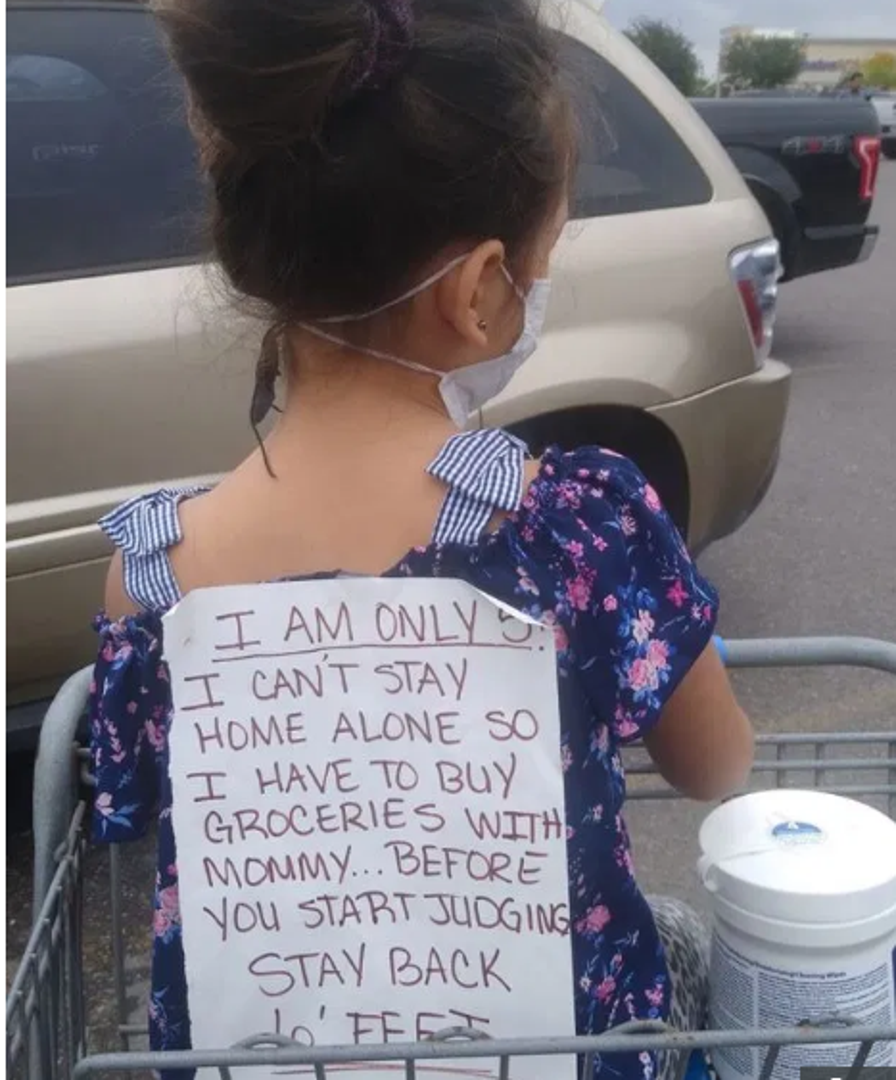 "Imam samo pet godina, ne mogu ostati sama kod kuće, pa moram ići s mamom kupovati namirnice. Prije nego krenete osuđivati, odmaknite se i držite razmak."
