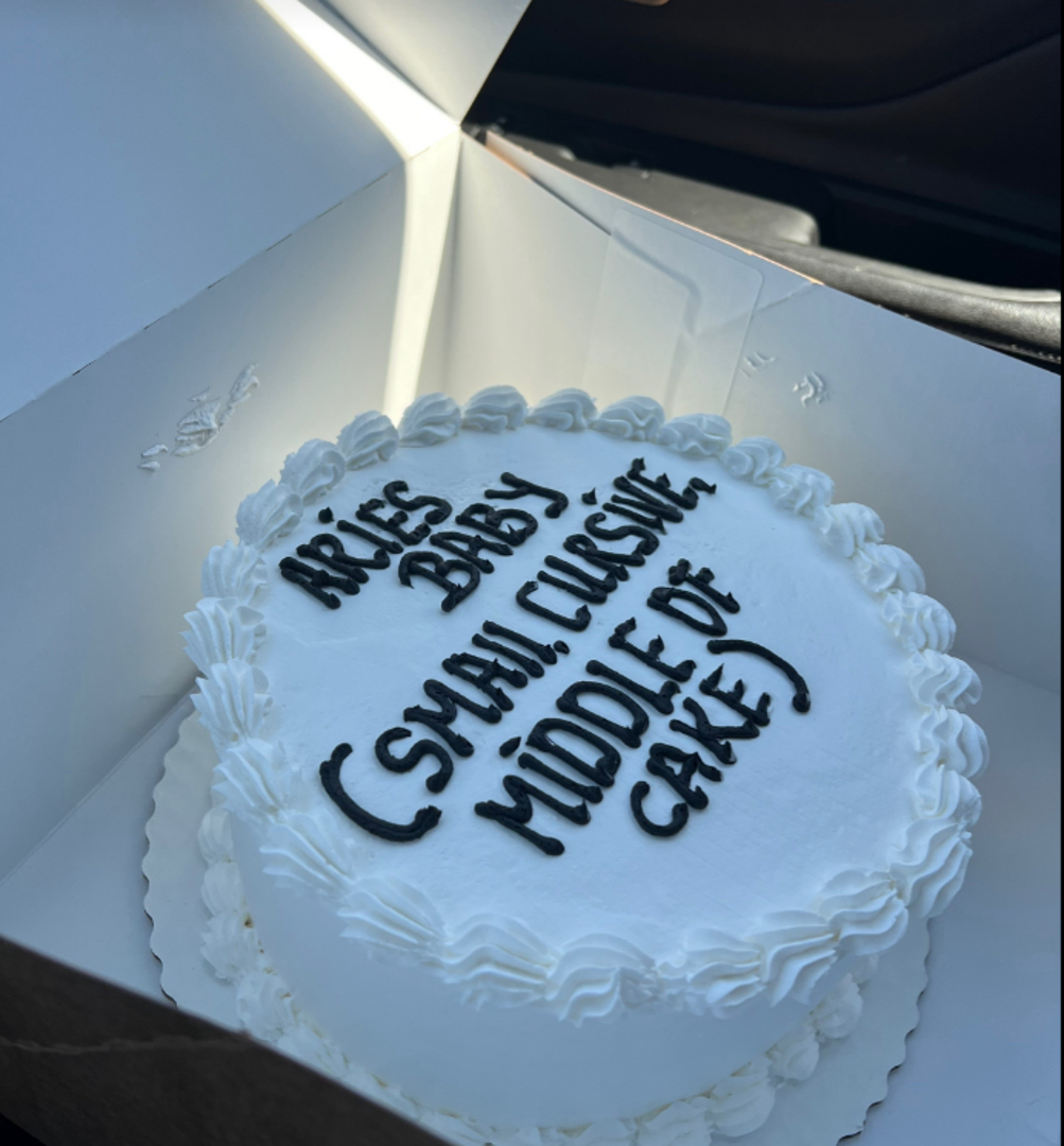 Iako je konačni proizvod sadržavao bijeli, kružni dizajn s nježno oblikovanim rubovima, nešto je ipak bilo pogrešno. Ispostavilo se da je slastičar napisao Peytonine upute u sredini torte. "Aries baby (mali kurziv u sredini torte)", urnebesno je pisalo na torti. Peytonin video od tada je dobio brojne komentare, a korisnici su bili jednako zapanjeni kao i ona kad su vidjeli da torta baš i nije uspjela.