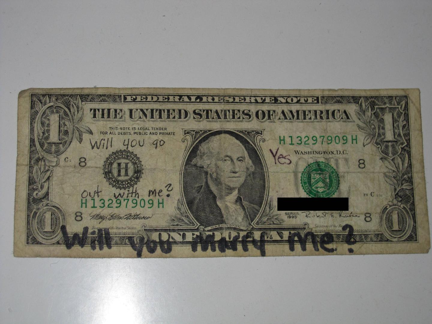 Korisnik Reddita Jason ispričao je kako je osvojio svoju ženu novčanicom od jednog dolara, odnosno iznosom od oko sedam kuna. Ona mu je kupila žvakaće gume, a on joj je samo htio vratiti novac. Neko vrijeme su si vraćali ovu novčanicu, a završilo je tako da ju je istom novčanicom, nekoliko godina kasnije i zaprosio.