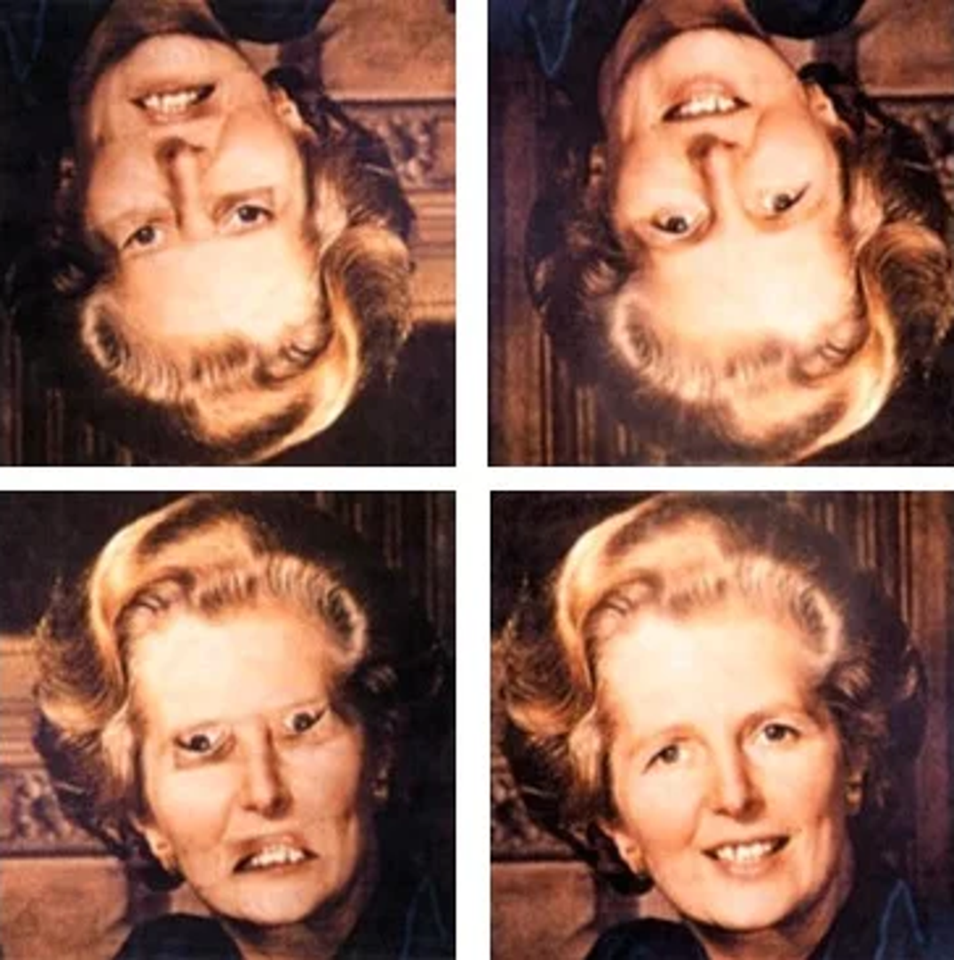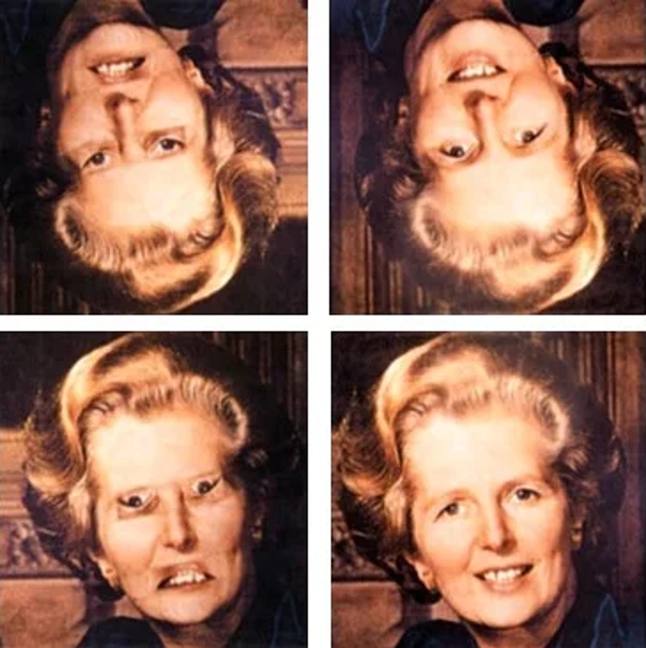 Iako smo svjesni činjenice da je fotografija, odnosno lice na fotografiji okrenuto obrnuto, s time se toliko rijetko susrećemo da je mozgu jako teško isprocesuirati kakav se izraz lica nalazi na onome što vidi. "Tačerovski efekt" zapravo je najlakše objasniti time da nismo u stanju vidjeti promjene na licu ako je okrenuto naopako, a odmah ih primjećujemo ako lice stoji onako kako smo navikli gledati.