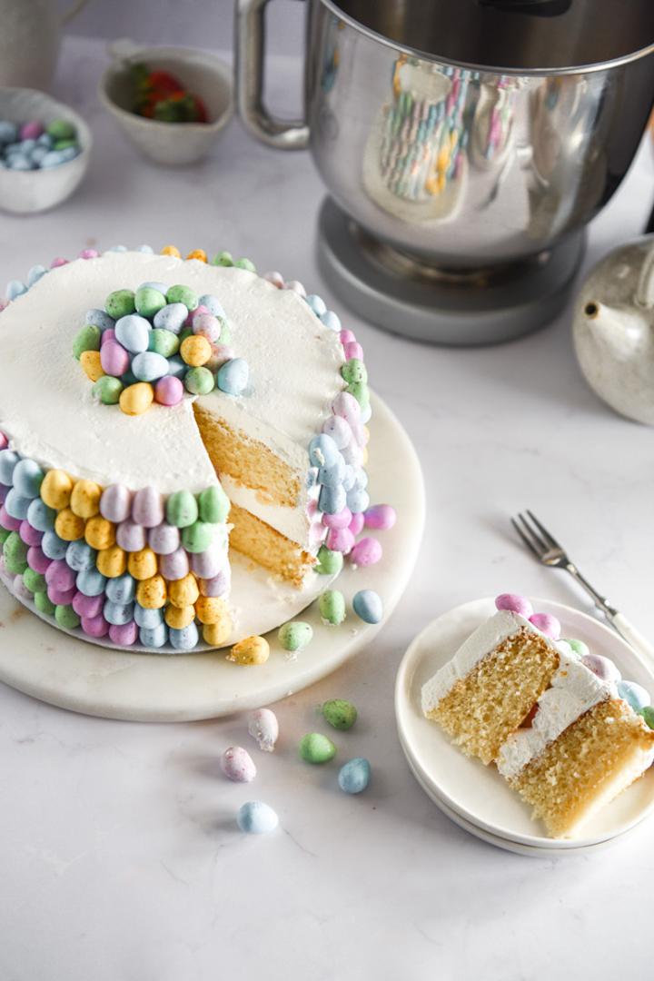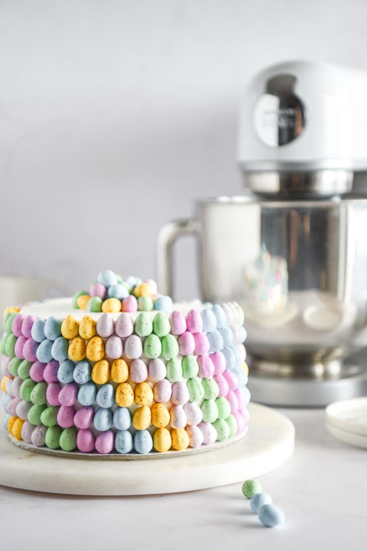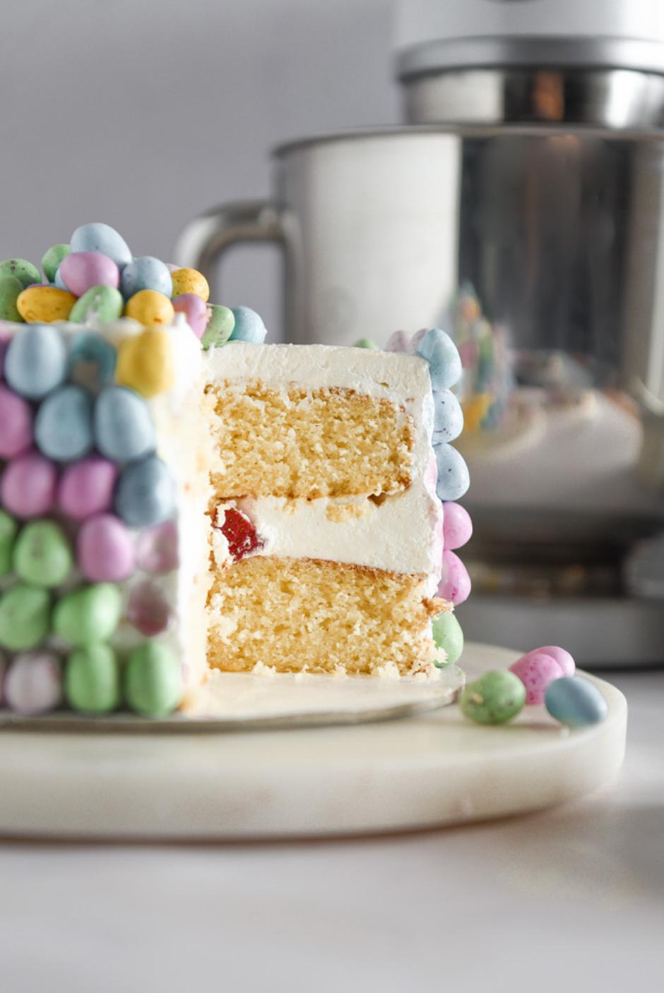 Na pladanj za torte postavite prvi biskvit. Stavite kremu od mascarponea pa po njoj rasporedite iskidane jagode. Preklopite s drugim biskvitom. Cijelu tortu obložite kremom. Sada složite M&M čokoladna jaja u bojama. Krenite od dna, nakon što ste napravili cijeli krug krenite s drugim redom i tako dok ne dođete do vrha torte. Od ostatka jaja napravite malu hrpicu na vrhu torte. Ohladite prije posluživanja.
