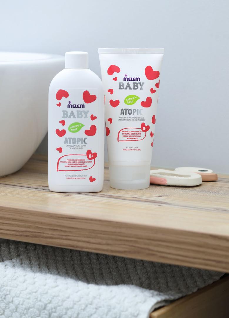 Razvijeni u suradnji s dermatolozima, Melem Baby Atopic proizvodi pružaju intenzivnu njegu i zaštitu suhe i osjetljive kože, umiruju nadraženu kožu te oporavljaju hidrolipidni sloj kože. Bogati prirodnim sastojcima moćnog djelovanja, poput polidokanola, omega-6 masnih kiselina, ceramida, skvalana, vitamina B3 i kompleksa hranjivih ulja masline, nevena, noćurka i podlanka, pružaju cjelovitu njegu vrlo suhoj i atopiji sklonoj koži već od novorođenačke dobi.