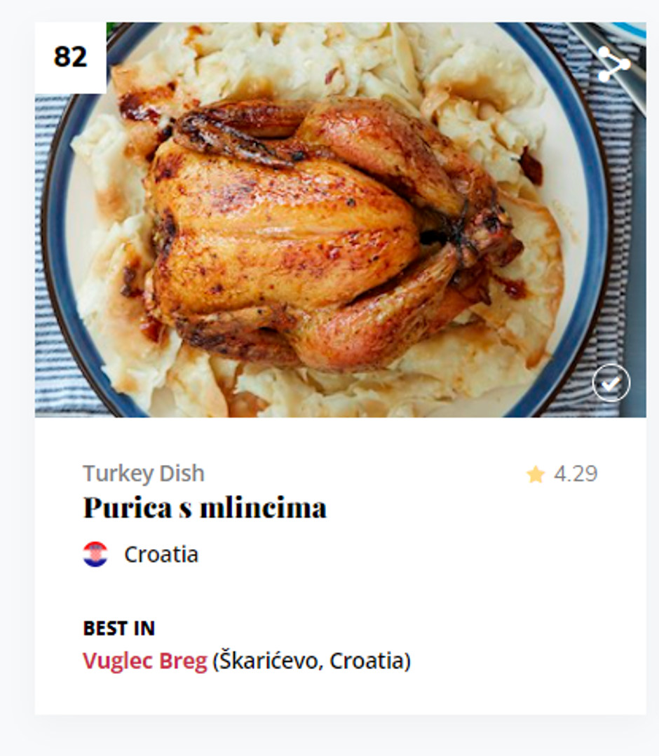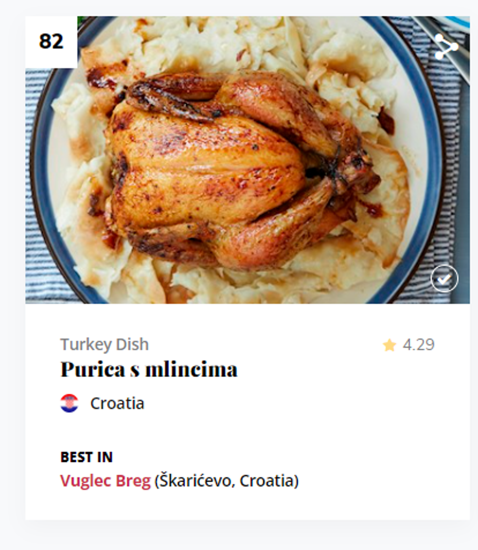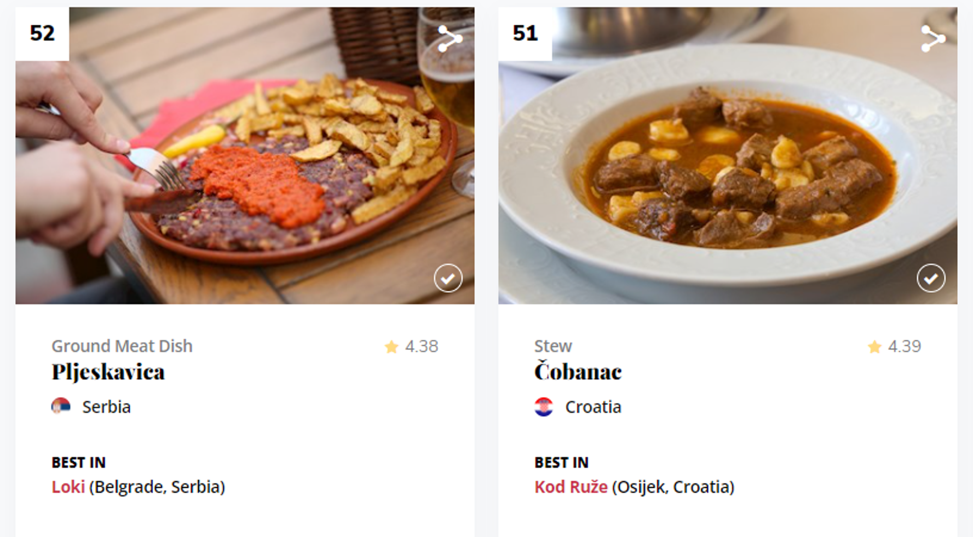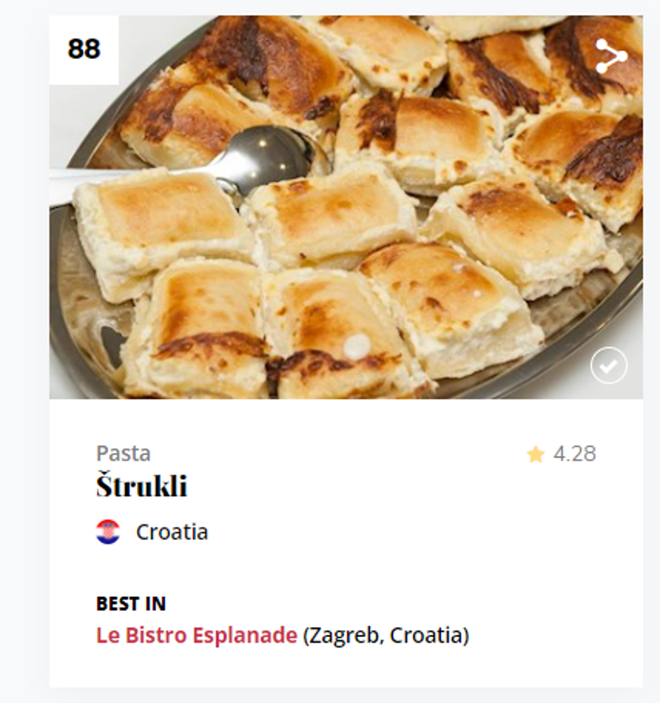 Hrvatska je zauzela 36. mjesto s kotlovinom, 51. s čobancem, 55. s crnim rižotom, 82. mjesto s puricom i mlincima, i 88. mjesto sa štruklima za koje pišu da su najbolje u Esplanadi.
