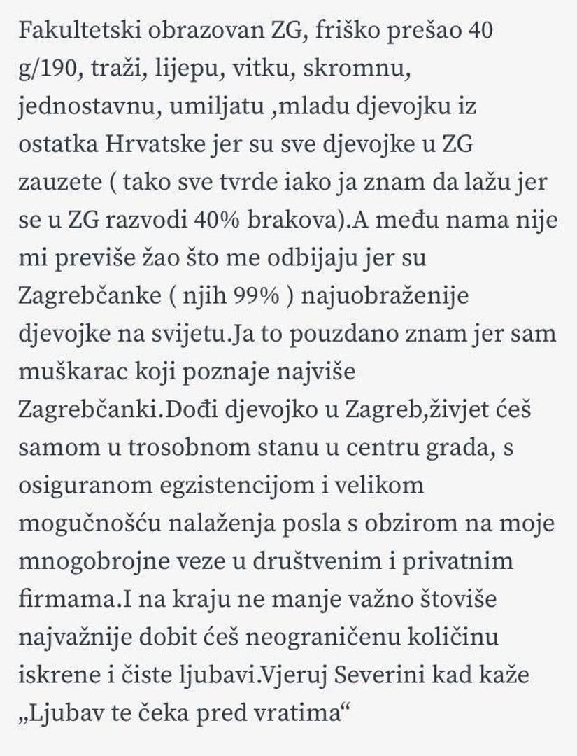 Muškarac u oglasu navodi da je obrazovan, da ima 40 godina, a da tražena djevojka ne smije biti iz Zagreba jer su sve takve zauzete. "Tako sve tvrde iako ja znam da lažu jer se u Zagrebu razvodi 40 posto brakova", stoji u napomeni. Dodao je da je 99 posto Zagrepčanki uobraženo.