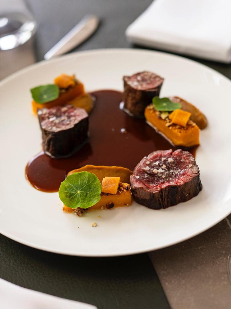Sva jela, a trenutačno ih je na meniju petnaestak, istovremeno odaju počast lokalnom terroiru i donose dašak suvremenog fine dininga. Jesenski jelovnik prožet je bojama i okusima sezone pa na tanjurima dominiraju šumske note, zemljani tonovi i svježina plodova iz vrta. Marinirana jadranska riba s agrumima i ikrom pastrve otvara priču o jadranskom podneblju u modernoj interpretaciji rižota, dok ragu od srnetine s njoketima i prahom od maline spaja divljač s neočekivanim, profinjenim aromama. Jelenski file u raskošnoj kombinaciji s kremom i confitom od buče te demiglaceom sa šljivama evocira toplinu jeseni i daje novu dimenziju tradicionalnim jelima kontinentalne Hrvatske. To je ujedno i jelo koje preporučujemo svakome da proba, čak i onima koji inače nisu ljubitelji divljači. Bez lažne skromnosti, ovo je jedan od najbolje spravljenih jelena koje smo probali.