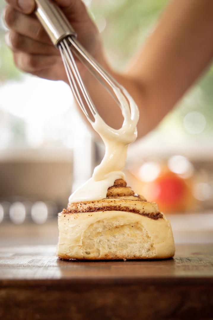 Rolice prije pečenja premažite veganskim maslacem (otopljenim) i pokrijte plastičnom folijom. Stavite sa strane da se ponovno digne dok zagrijavate pećnicu na 176 °C. Kad se pećnica zagrije, pecite rolice 25-30 minuta ili dok blago ne porumene. Pustite da se ohlade nekoliko minuta, premažite glazurom od šećera u prahu ili veganskog krem sira i odmah poslužite.