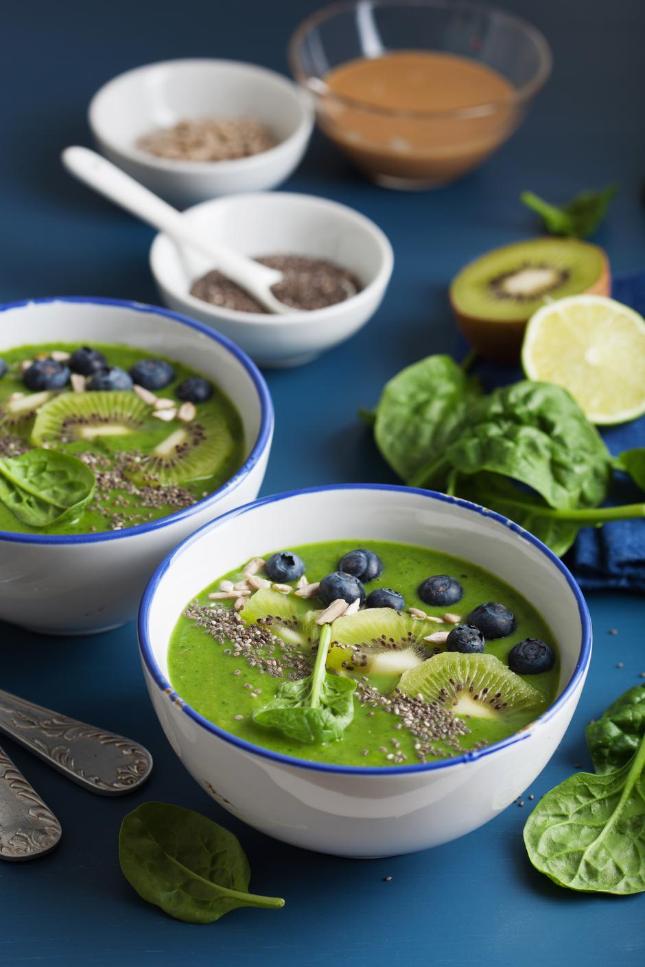 U blender ubaciti špinat, kikiriki maslac, bademovo mlijeko, vodu, bananu, nekoliko borovnica i pola žlice chia sjemenki te stisnite gumb za blendanje. Smoothie stavite u omiljenu zdjelicu ili čašu te po želji ukrasite s ostatkom chia sjemenki, ostatkom borovnica i s pola kiwija.