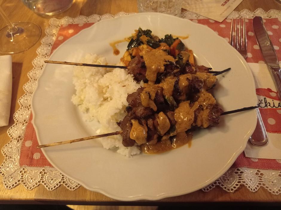 Za nas su ipak pogodak večeri bili char siu ražnjići. Char siu je kinesko jelo, zapravo svinjetina s roštilja, začinjena nekim tradicionalnim tamošnjim umakom i začinima. Ovdje se radi o mariniranom svinjskom vratu, umaku od kikirikija, začinjenom kimchijem, a jelo je posluženo kako treba, s rižom i povrćem pirjanim na vatri. Dakle, to jest char siu, ali u “balkaniziranoj” verziji, dakle, na štapiću. Kako inače volimo azijsku hranu, njezinu pikantnost i osobitost okusa, nama je ovo jelo bilo sjajno.