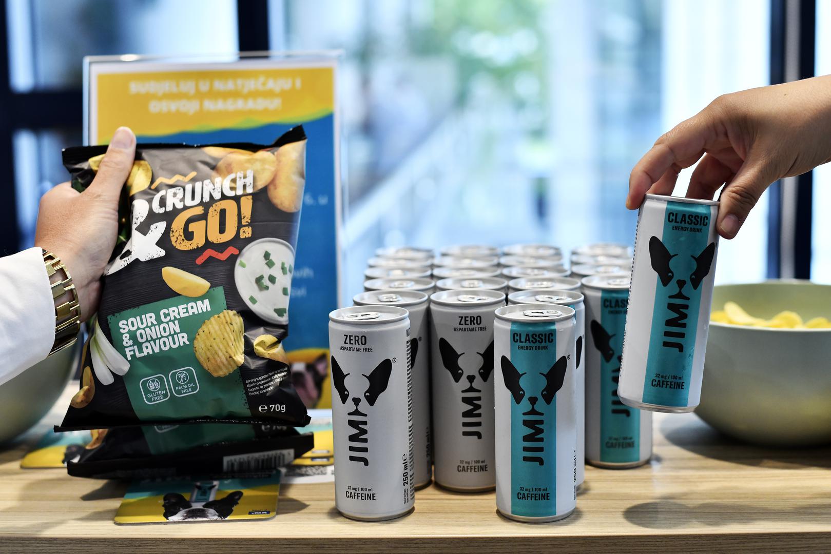 Energetski napitak Jim sadrži jednako energije kao i šalica espressa te 5 različitih vitamina B – B2, B3, B5, B6 i B12. Ne sadrži konzervans, a kupci mogu birati između voćnog okusa tutti frutti i verzije bez šećera koja ne sadrži aspartam*. Ambalaža pića izrađena je od materijala koji se mogu u potpunosti reciklirati. Crunch&Go čips napravljen je od kvalitetnog krumpira koji se najnovijom tehnologijom oblikuje u savršeno hrskavu i valovitu poslasticu u čak četiri različita okusa – slani, light, paprika, luk i kiselo vrhnje. Slani i light čips od krumpira čini još posebnijim sol iz poznatog rumunjskog rudnika soli Parajd u obliku kristala koji su stari više od 20 milijuna godina te sadrže čak 84 različita minerala.