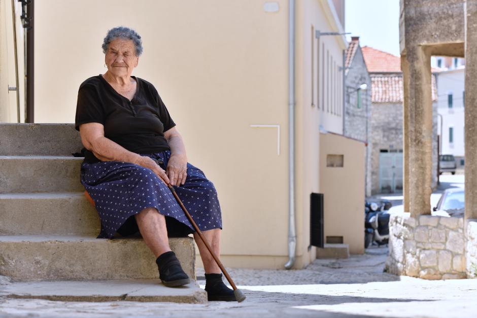 Bakica koja sjedi ispred kuće – svakodnevni prizor tu na otoku. Gleda ona tko prolazi. Tko dolazi. Nigdje nikog. Zvizdan je, temperatura na Murteru kao da smo na – Suncu. OK, malo je hladnije nego gore, ali ne puno.