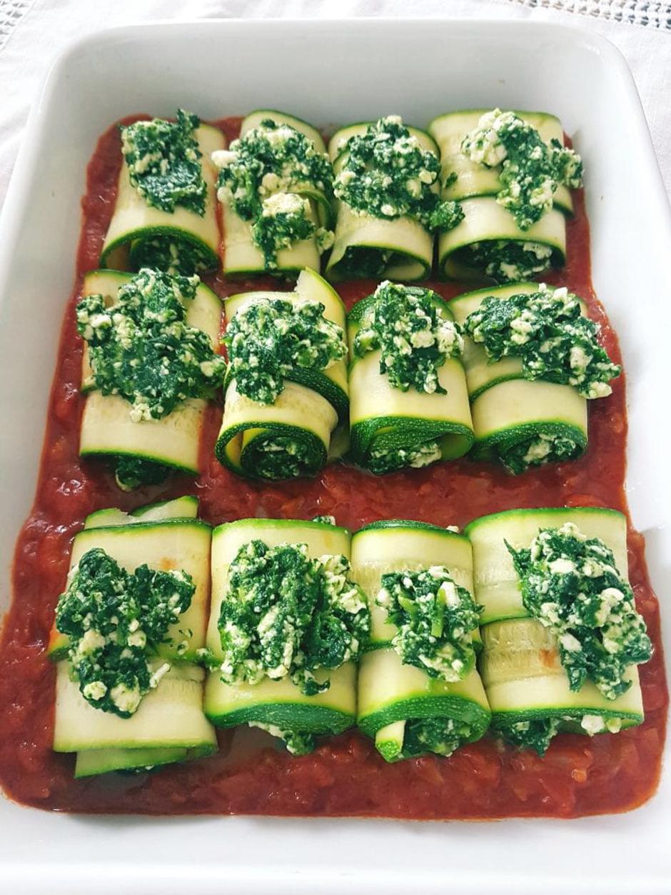 Pelate usitnite, luk nasjeckajte na sitno. Luk pirjajte na maslinovu ulju dok ne postane staklast. Ubacite usitnjeni češnjak i promiješajte. Ubacite pelate koje ste prethodno usitnili. Dodajte prstohvat soli i šećera pa kuhajte 30-ak minuta da dobijete gustu šalšu. Tikvice operite i odstranite im krajeve. Nožem ih po dužini narežite na tanke šnite. Posolite i pustite ih da stoje 20-ak minuta kako bi ispustile vodu. U međuvremenu operite špinat, odstranite mu tvrdi dio peteljke i ubacite ga u lonac kipuće vode da se kuha 2-3 minute. Dobro procijedite i istisnite svu tekućinu. Nožem nasjeckajte špinat pa ga pustite da se ohladi. U zdjelu stavite sir, zgnječite ga vilicom. Dodajte 1 jaje, sol, papar. Sve dobro promiješajte pa ubacite špinat i sjedinite ga sa sirom. Kušajte i dodajte začine po potrebi. Tikvice papirnatim ručnikom obrišite da odstranite višak vode. U posudu za pečenje stavite šalšu. Tikvice slažite tako da uzmete 2 šnite i složite ih po duljini tako da se preklapaju na krajevima. Dodajte žličicu smjese od sira i špinata pa pažljivo zarolajte. Slažite rolice na šalšu. Pećnicu zagrijte na 200º C. Ako vam je ostalo smjese, slobodno stavite na tikvice i sve posipajte ribanim parmezanom. Neka se peče oko 30 minuta. Pred kraj pečenja na svaku tikvicu stavite komadić topivog sira i još kratko zapecite.