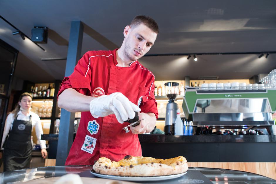 "Trudimo se biti drugačiji od drugih, imati nešto novo, svoje pizze... Tijesto stoji više od 48 sati, fermentira se. Zatim se napravi pire od batata s tartufima, zapečemo je, pa završimo s kozjim sirom od tartufa, Grana Padanom i jednim svježim tartufom koji se dodaje na vrh - pred gostom", objasnio je.