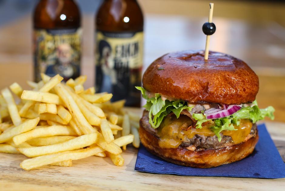 Burger je od mljevenog odreska Black Angus, sa špekom, lukom, salatom sirom cheddar, tajnim umakom i krumpirićima.