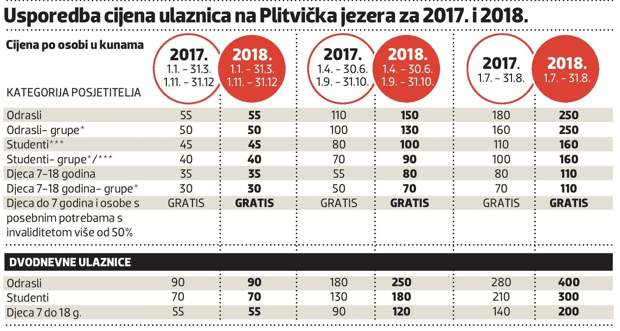 Posjet Plitvičkim jezerima dogodine otprilike u ovo vrijeme bit će 70 kuna skuplji nego sada. Ulaznice u ovaj dragulj prirode ni sad nisu jeftine, tijekom dva ljetna mjeseca odrasla osoba plaća 180 kuna, a iduće godine poskupljuju za sva razdoblja i za sve skupine posjetitelja. Nepopularno, ali neizbježno, poručuju iz Javne ustanove NP Plitvička jezera. Broj posjetitelja od početka godine raste po stopi od 40 posto i do kraja 2017. na Plitvicama računaju da će broj s lanjskih 1,4 milijuna narasti na okrugla dva milijuna. Prijeratni broj od oko 700.000 posjetitelja godišnje tako bi se mogao i utrostručiti.