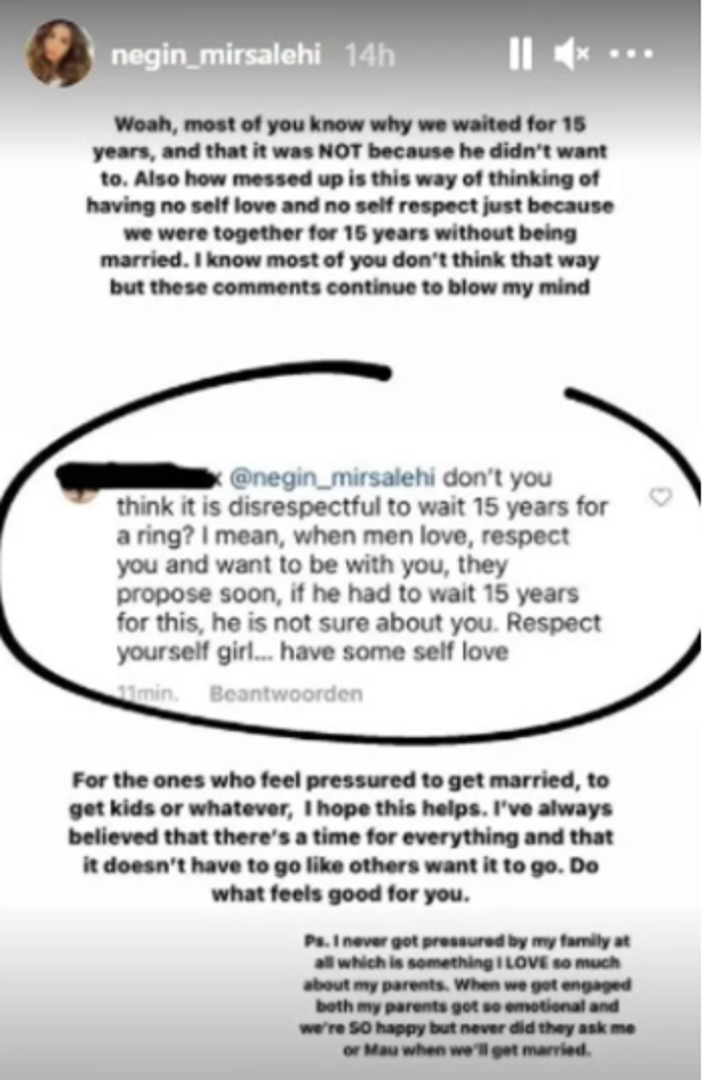 Influencerica iz Nizozemske nije mogla ignorirati ovakve komentare, pa je jedan od njih objavila i na storyju. "Većina zna zašto smo ovoliko čekali i ne, nije bilo zato jer on nije htio. Misliti da nemaš samopoštovanja jer si s nekim 15 godina, a niste u braku je zaista pogrešno. Znam da puno ljudi ima takvo mišljenje, ali me ovakvi komentari i dalje šokiraju", napisala je i poručila da nitko ne treba osjećati pritisak da mora imati djecu ili stupiti u brak, ako to u tom trenutku jednostavno ne želi.