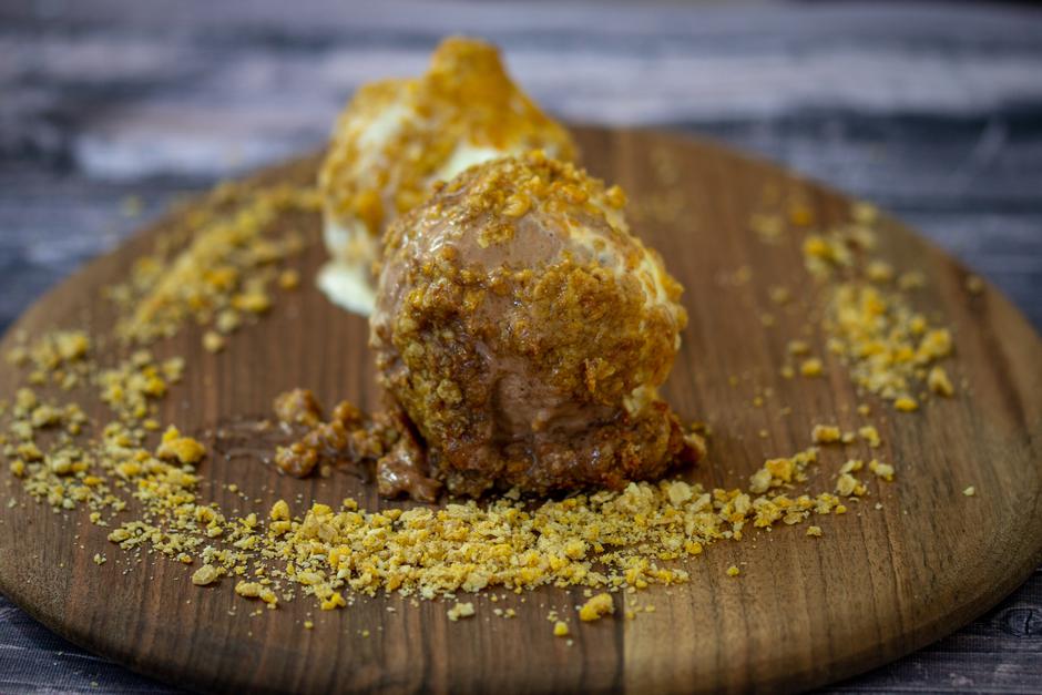 Prozirnu foliju "iskrojite" tako da prekrije unutrašnjost plitke, široke čaše. Zatim u foliju stavite kuglicu sladoleda, pa šaku kikirikija i opet kuglicom sladoleda sve zatvorite. Izvucite sve zajedno s prozirnom folijom, formirajte veliku kuglu i zatvorite foliju kao bombon. Tako formirane kugle spremite na 2 sata u zamrzivač. Kukuruzne pahuljice, kikiriki i cimet sameljite i sjedinite, a posebno razmutite jaje u jednoj posudi. Nakon dva sata formirane kugle prvo dobro uvaljajte u smjesu kukuruznih pahuljica, zatim u jaje, pa ponovo u kukuruzne pahuljice. Sada ubacite kuglu u vrelo ulje pa je dvije-tri sekunde okrećite kako bi se oko sladoleda formirala hrskava korica. Poslužite odmah da se sladoled ne bi rastopio.