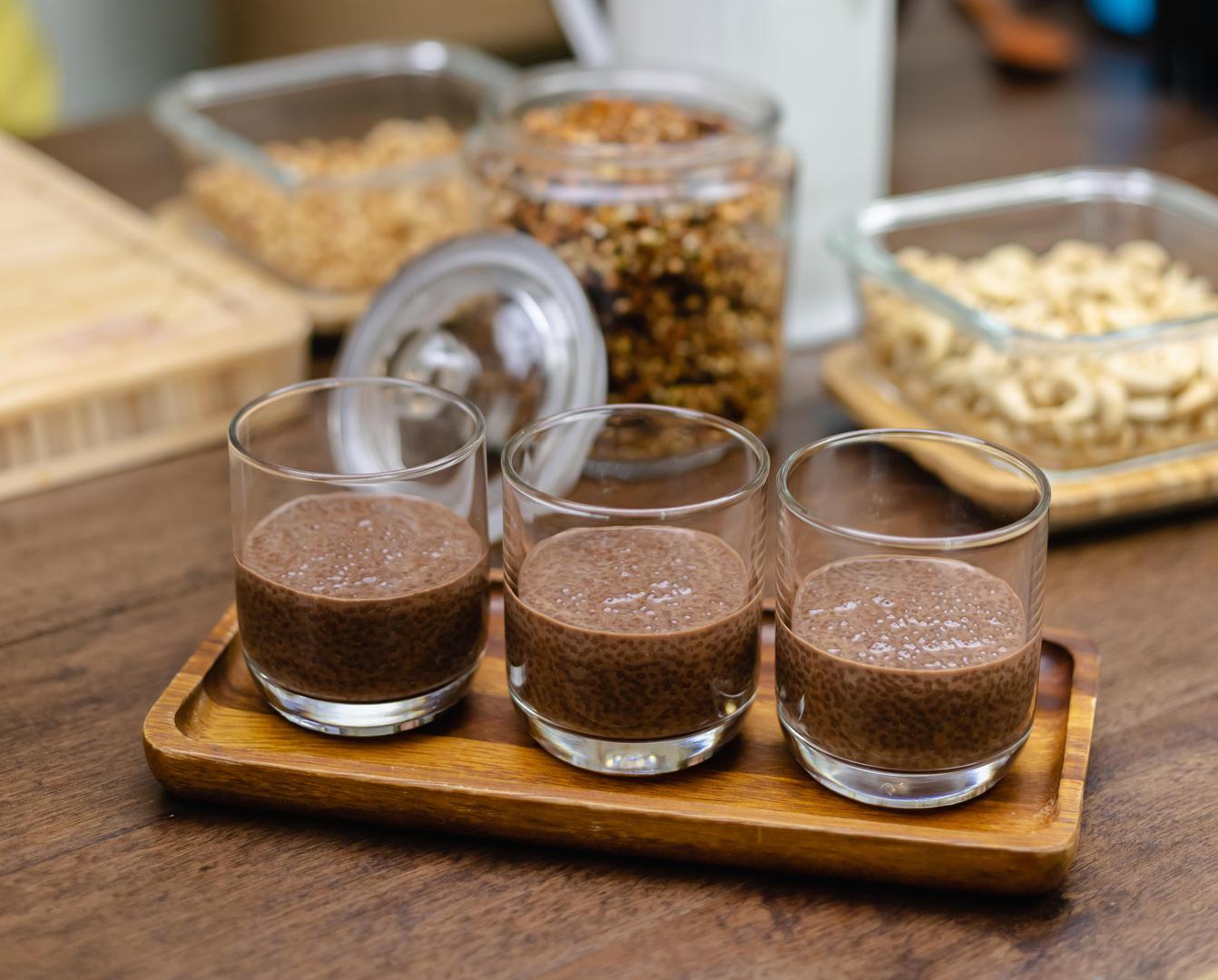 Pomiješajte zobeni napitak, instant kavu, chia sjemenke, 80 grama šećera i vanilin-šećer u loncu i miješajte dok ne dobijete glatku smjesu. Kuhajte smjesu oko dvije minute. Vruću smjesu izlijte u silikonske kalupe i ostavite da se hladi najmanje sat vremena.