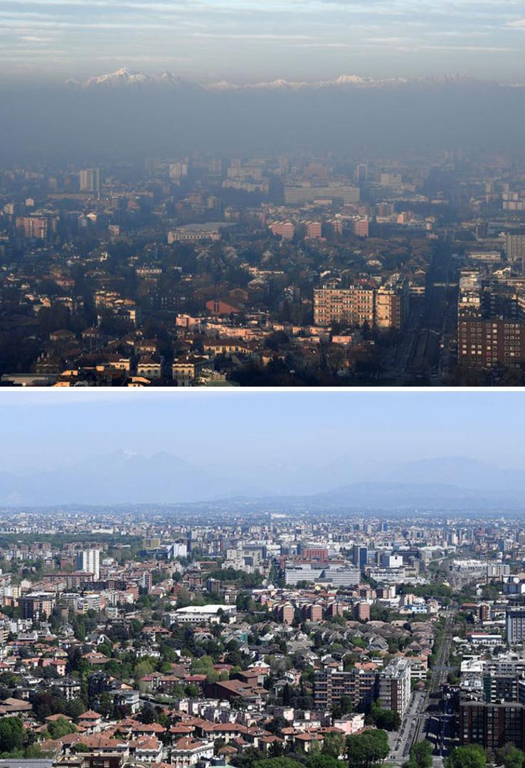 Milano u Italiji 2008. godine proglašen je najzagađenijim gradom u Europi, a smog predstavlja veliki problem. Ipak, za vrijeme karantene onečišćenost zraka je drastično pala, pa rade na tome da koliko toliko zadrže tu razinu i jednom kada karantena prestane. Gornja fotografija nastala je prije četiri mjeseca, a donja 17. travnja.