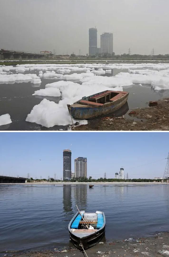 Prošle godine Indija se popela na vrh ljestvice najzagađenijih zemalja na svijetu, ali rijeka Yamuna u New Delhiju koja je fotografirana 21. ožujka 2018. godine ne prepoznatljiva je na fotografiji okinutoj 8. travnja.