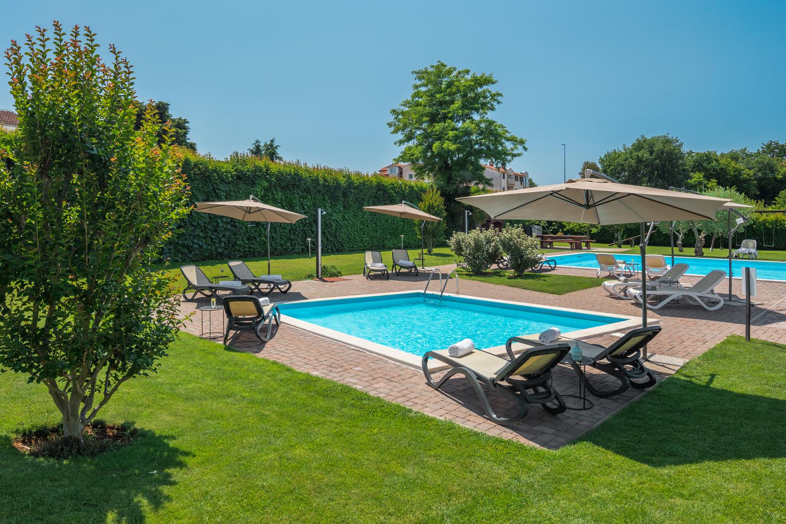 Poreč: je grad na zapadnoj obali Istre koji je ljubiteljima povijesti omiljen zbog Eufrazijeve bazilike, spomenika svjetske kulturne baštine, pod zaštitom UNESCO-a, kojeg obavezno morate posjetiti. Ovdje već sada možete uživati i u morskim radostima, a i oni željni istraživanja zadovoljit će svoja očekivanja jer je Poreč prekrasno polazišno odredište za istraživanje prirodnih ljepota obližnjeg Limskog kanala ili bajkovite unutrašnjosti Istre. Ako ste osim mora, također i ljubitelj bazena, apartmani Maj Premium Residence nude dva vanjska bazena, uz razne aktivnosti poput vožnje biciklom, šetnje prirodom ili plivanja.