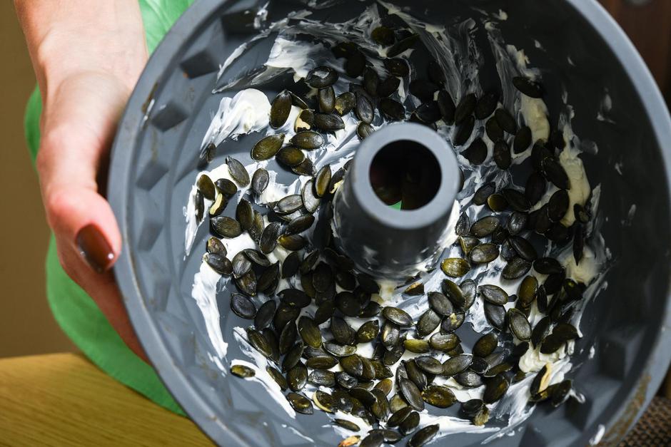 Kalup za kuglof premažite maslacem i pospite bučinim košticama. Stavite na kratko u hladnjak. Izmutite jaja i šećer pa dodajte ulje i vodu, a zatim brašno pomiješano s praškom za pecivo i vanilin šećerom. Dobro izmiješajte i izlijte u kalup. Pecite 40-45 minuta na 170 stupnjeva.