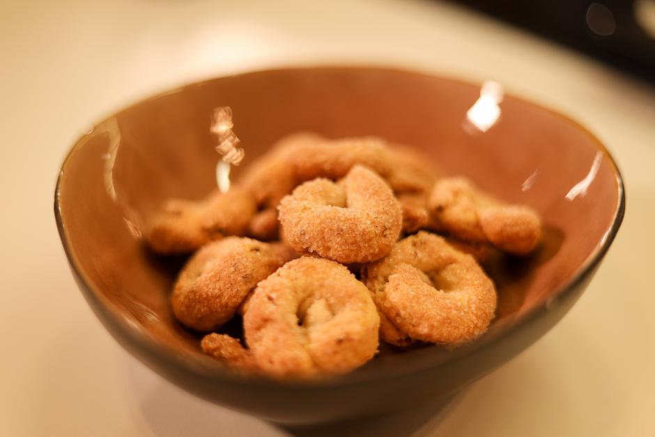 Sjemenke anisa potopite u vinu i ostaviti par sati da nabubre. Ako i nemate toliko vremena, isto će biti dobro. Od svih sastojaka umijesite tijesto. Ne treba dugo mijesiti, čim se spoji, spremno je za oblikovanje. Male komadiće tijesta rukama razvaljajte, preko prsta premotajte u oblik prstena i jednom stranom umočite u šećer. Položite na pleh sa stranom umočenom u šećer prema gore. Pecite na 165 °C 35-40 minuta.