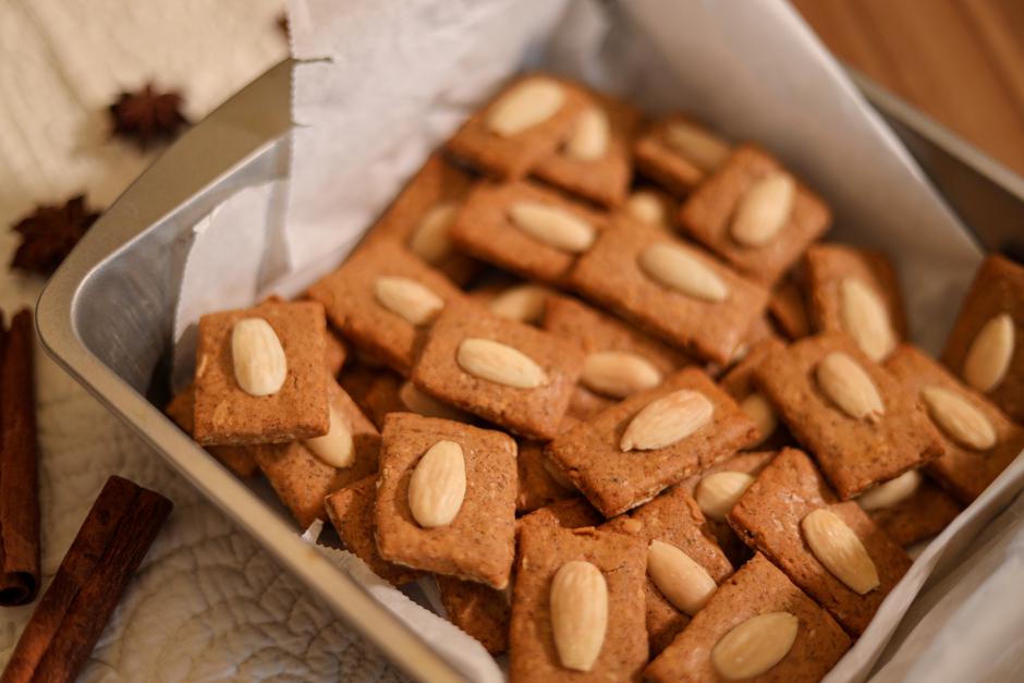 Maslac i med otopite. Dodajte začine, sol i šećer. Ohladite. Umiješajte u suhu smjesu i umijesite tijesto. Ostavite tijesto u hladnjaku da počiva do sutradan. Razvaljajte tijesto dosta tanko. Režite na pravokutnike, premažite mlijekom, lagano utisnite polovice blanširanih badema. Pecite na 160-170 °C 10 minuta. Ohladite medenjake i spremite ih u hermetički zatvorenu posudu, mogu dugo trajati (ako nemate "mišiće" u kući kao ja).