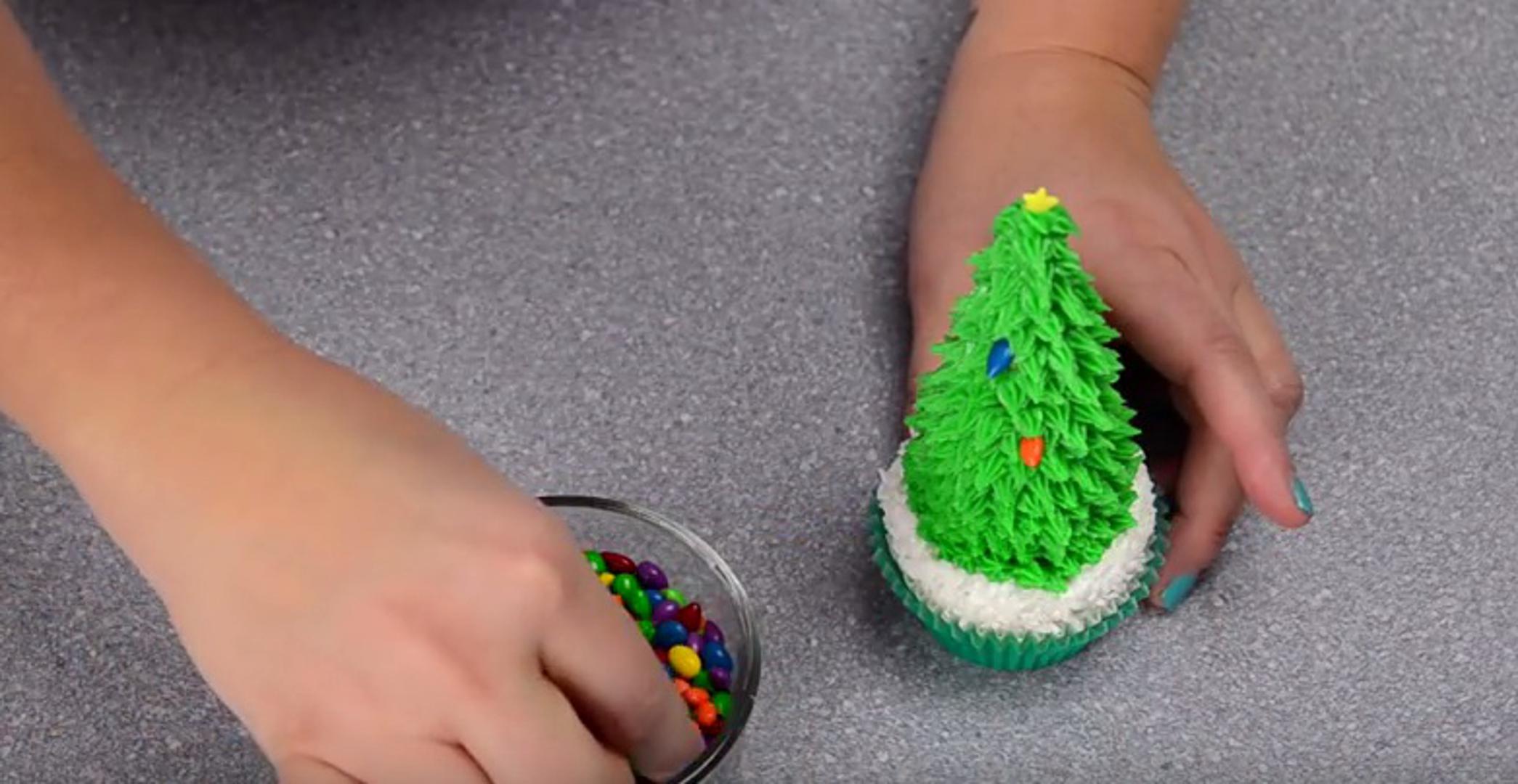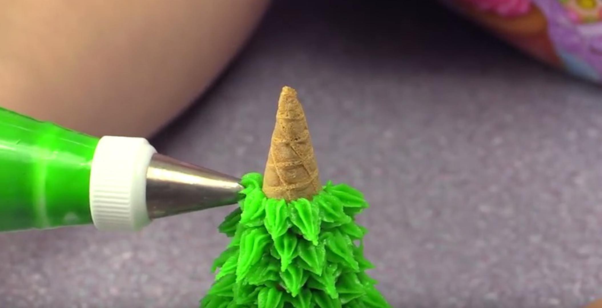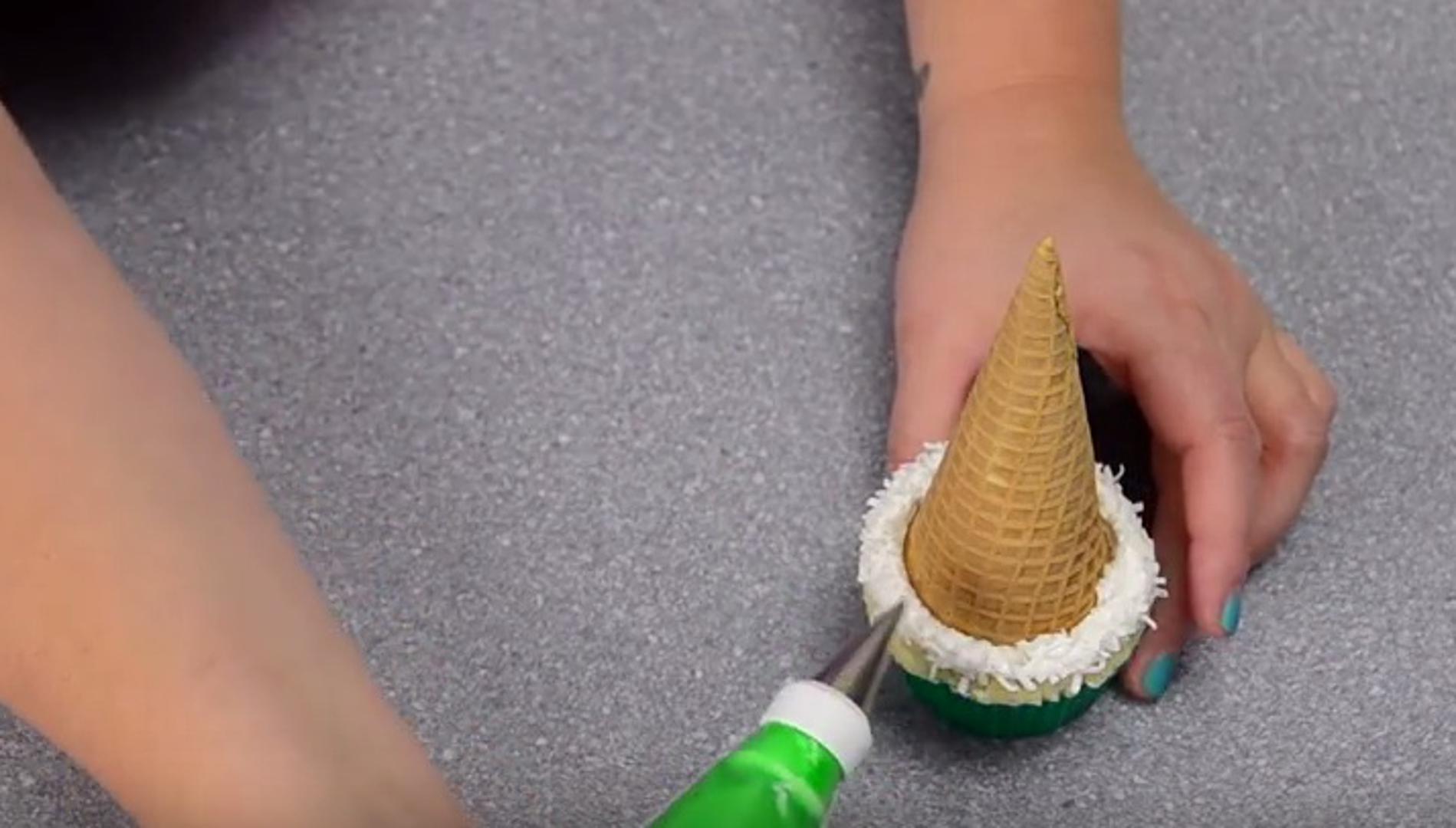Uzmite kornet i sa širokom stranom ga naslonite na prsten od kreme kako biste dobili oblik drvca na muffinu.