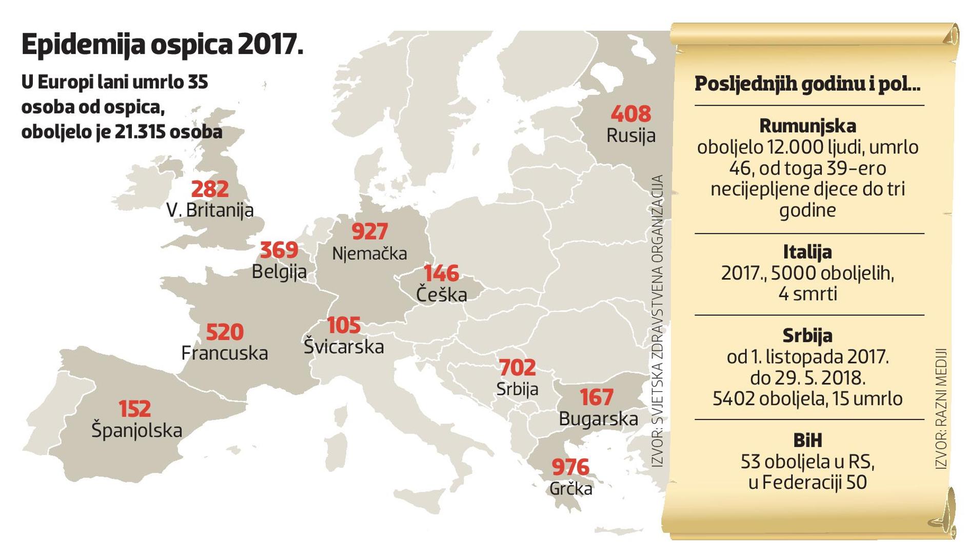 U 2017. ospice su odnijele 35 života u Europi, podaci su regionalnog ureda Svjetske zdravstvene organizacije (WHO) za Europu sa sjedištem u Kopenhagenu. Lani se broj oboljelih od ospica povećao četiri puta. Zabilježeno je ukupno 21.315 slučajeva oboljelih, dok je 2016. bilo 5273 slučaja. Do povećanja broja zaraženih došlo je u 15 od 53 zemlje u Europi. Rumunjska je imala najveći broj zabilježenih slučajeva – 5562, nakon nje slijede Italija (5006) i Ukrajina (4767). Velike epidemije izbile su 2017. u Grčkoj (967 slučajeva), Njemačkoj (927), Srbiji (702), Tadžikistanu (649), Francuskoj (520), Rusiji (408), Belgiji (369), Velikoj Britaniji (282), Bugarskoj (167), Španjolskoj (152), Češkoj (146) i Švicarskoj (105). U Rumunjskoj se epidemija razbuktala pa je u zadnjih godinu i pol ondje oboljelo čak 12 tisuća ljudi, a umrlo 46. Strašna je činjenica da su to uglavnom bila djeca – 39 necijepljene male djece u dobi do tri godine.