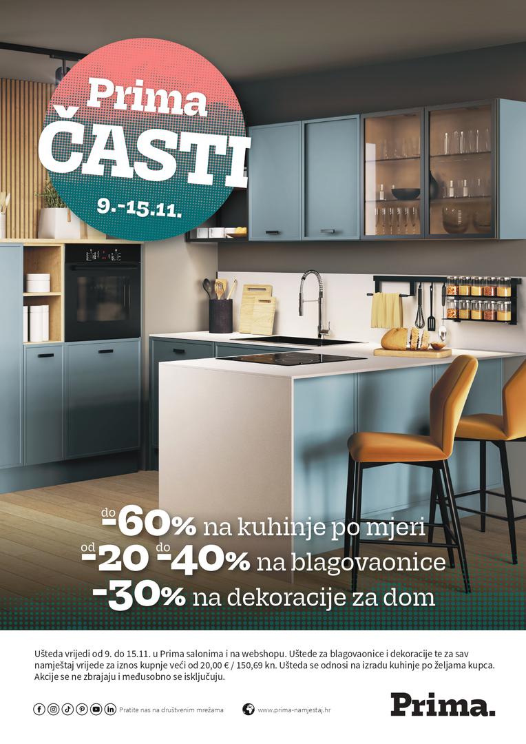 Uvjerite se u najbolju kvalitetu, estetiku i najpovoljnije cijene, a stručni prodajni savjetnici pomoći će vam pri odabiru namještaja i dekoracija po mjeri i stilu vašeg doma. Inspiraciju za uređenje doma možete pronaći u najnovijem letku te na Prima službenom Facebook, Instagram, TikTok i Pinterest profilu.