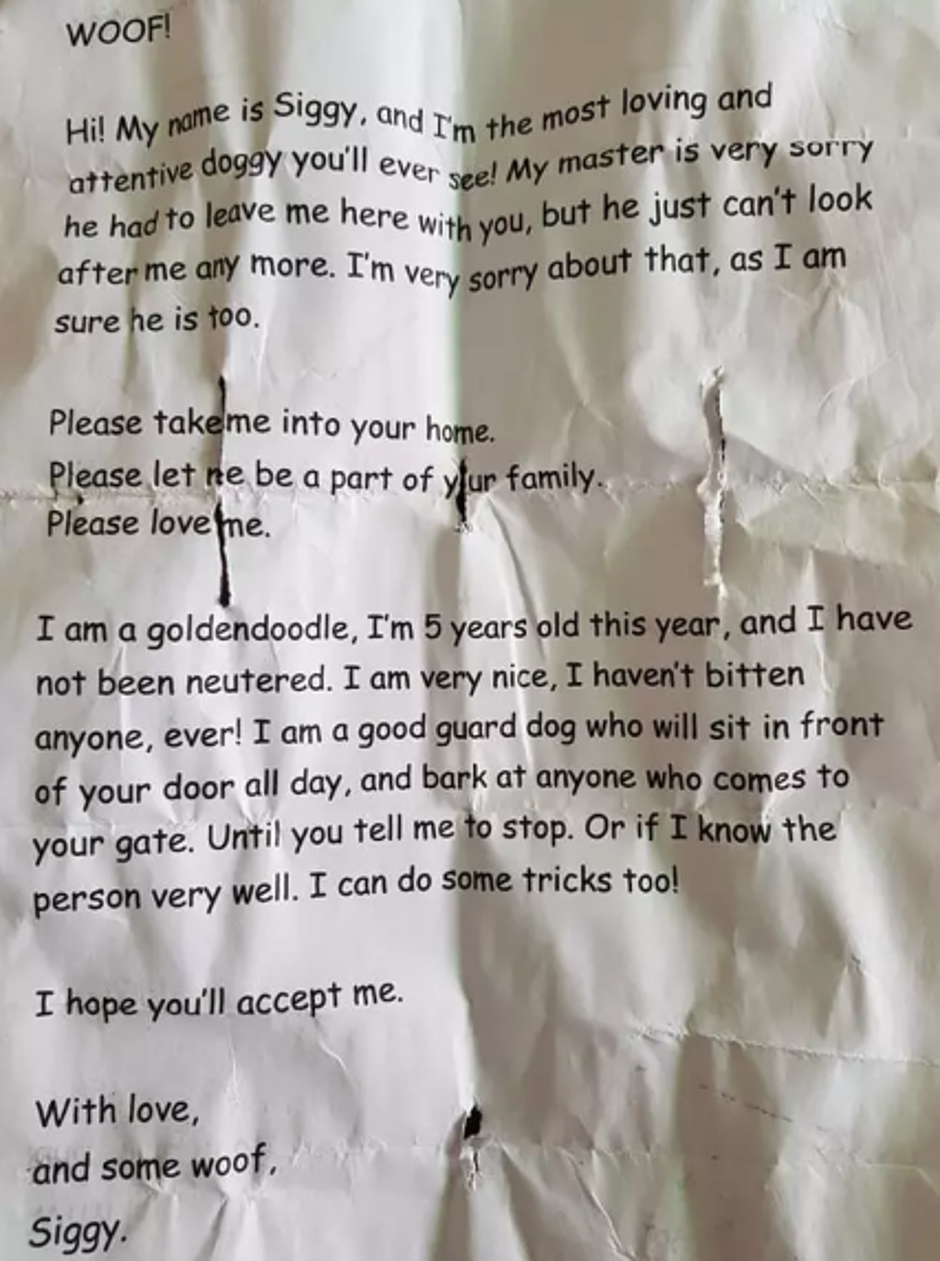 "Bok, moje ime je Siggy i jako sam umiljat i dobar pas. Mojem vlasniku je jako žao što me ostavio ovdje, ali nije se više mogao brinuti o meni. Tužan sam zbog toga, a vjerujem da je i on. Molim vas, odvedite me kući, pružite mi ljubav, dajte da budem dio vaše obitelji. Mješanac sam zlatnog retrivera i pudla i ove godine ću napuniti pet godina. Dobar sam, nisam nikoga do sada ugrizao! Zaštitnički sam nastrojen, sjedit ću ispred vaših vrata i lajati na svakoga tko se približi dok mi ne kažete da prestanem ili dok ne shvatim da već poznajem tu osobu. Znam i nekoliko trikova! Nadam se da ćete me prihvatiti, s ljubavlju, Siggy."