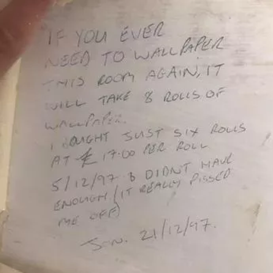Jedna je žena ostala zapanjena kada je u svojoj kući pronašla rukom pisanu poruku skrivenu ispod tapeta. Ona je bila usred renoviranja svoje kuće kada je otkrila poruku upozorenja koju joj je prethodni vlasnik ostavio da joj pomogne oko uređenja. Rukom napisana poruka otkrila je koliko će rola tapeta biti potrebno za prekrivanje sobe nakon što je stari vlasnik pogriješio, piše Mirror