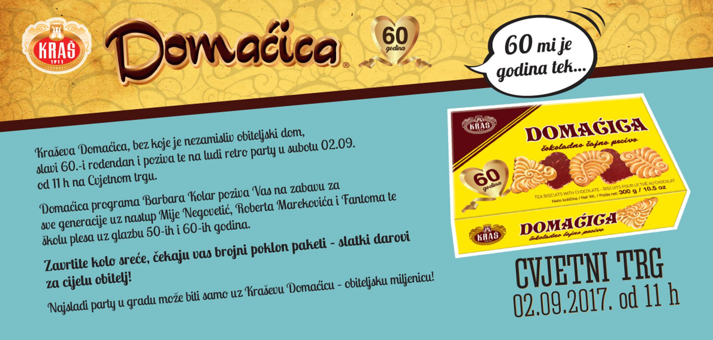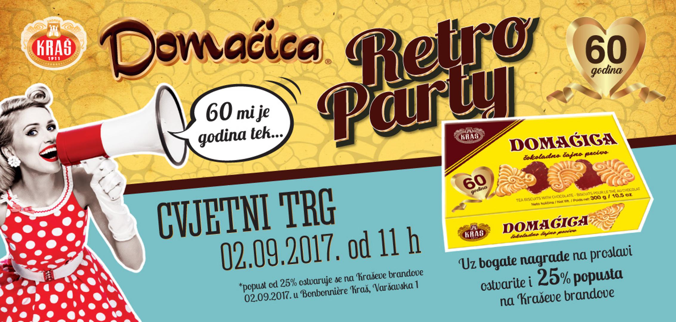 Na proslavi okruglog, jubilarnog rođendana Domaćice na Cvjetnom trgu, pozvani su svi, jer Kraševci su za vas pripremili bogati zabavni program namijenjen svim generacijama. Rođendansku proslavu krasit će retro duh 50-ih i 60-ih godina 20. stoljeća, s ciljem da se obilježi vremenski period u kojem je Domaćica nastala. Legendarna Domaćica na policama se trgovina ove godine pojavila u retro stilu, podsjećajući tako kupce da se u Kraševu asortimanu nalazi još od davne 1957. godine i da su uz nju odrasle brojne generacije.