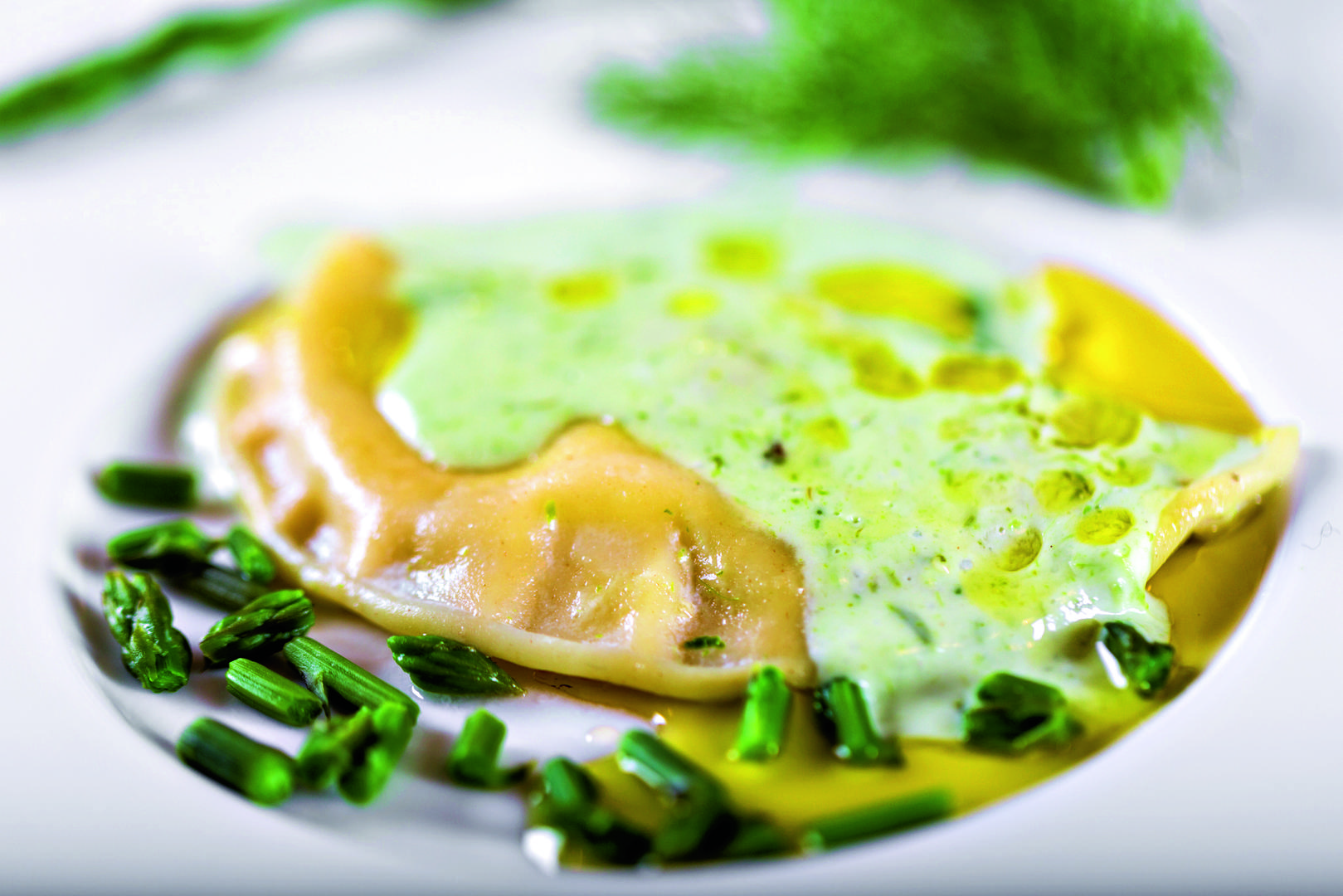 Ravioli punjeni sirom u umaku od divljih šparoga s pršutom à la Julienne